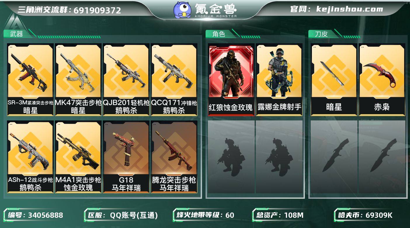QJJ152/包人脸/QQ区服【总资产:108M/近战赤枭+近战暗星+红狼蚀金玫瑰+S8赛季通行证已开】/烽火等级:60级/全面战场:23级/纯币:69309K/三角券加币:20(三角币20+三角券0)近战赤枭+近战暗星+红狼蚀金玫瑰+S8赛季通行证已开(2x3)+露娜金牌射手+守信不渝+锦绣捆绑包+鹅鸭杀捆绑包+捞点薯条捆绑包+马年祥瑞捆绑包+暗星捆绑包+特斯拉线圈捆绑包+骑士捆绑包/部门:12111/特勤等级(技术中心3级/工作台3级/制药台3级/防具台3级/仓库5级/指挥中心3级/训练中心6级/靶场4级/潜水中心1级/收藏室0级)M4A1突击步枪-阿米娅/M4A1突击步枪-独金玫瑰/AKM突击步枪-锦绣/ASh-12战斗步枪-鹅鸭杀/G3战斗步枪-骑士/CAR-15突击步枪-阿米娅/腾龙突击步枪-捞点薯条/腾龙突击步枪-马年祥瑞/橙色挂饰x5/段位:钻石IV(流动资产:98M)详情看图