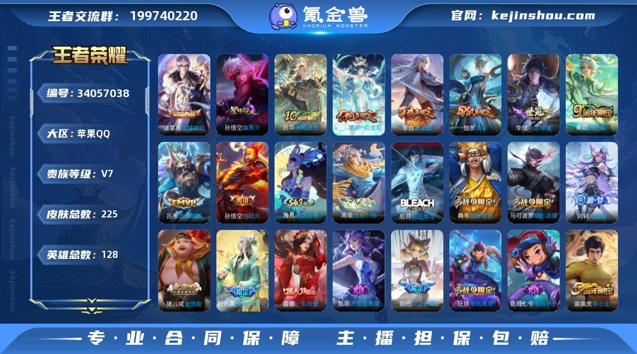 W16299,,可立即换绑无需挂单养号,,,铭文满级,,典藏1,,,传说8,,,星传说1,,,按键3,,,夺宝212,,苹果Q-V7-永恒钻石IV段位-128英雄-225皮肤-1典藏皮肤-8传说-55史诗 【英雄全皮】:猪八戒全皮 【荣耀典藏】:诸葛亮星域神启 【传说皮肤】:后羿神树通天,妲己愿照众生和,桑启鸣野蒿,吕布怒海麟威,李信一念神魔,伽罗太华,李白凤求凰,孙悟空地狱火 【限定皮肤】:狄仁杰阴阳师,赵云皇家上将,妲己时之彼端,嬴政白昼王子,孙尚香蔷薇恋人,鲁班七号狮舞东方,庄周高山流水,白起夜都怪侠,吕布猎兽之王,周瑜赤莲之焰,夏侯惇朔风刀,典韦穷奇,典韦蓝屏警告,马可波罗暗影游猎,狄仁杰魔术师,狄仁杰万华元夜,达摩沙漠行僧,项羽海滩派对,老夫子醍醐杖,程咬金演武夺筹,露娜一生所爱,王昭君午后时光,兰陵王驯魔猎人,兰陵王金庭之子,牛魔御旌,李元芳银河之约,李元芳云中旅人,钟馗神迹守卫,钟馗驱傩正仪,女娲朔望之晖,雅典娜单词大作战,蔡文姬繁星吟游,鬼谷子原初探秘者,鬼谷子五谷丰年,苏烈千军破阵,弈星混沌棋,沈梦溪星空之诺,沈梦溪大漠名商,明世隐疑决卦,明世隐吟游魔法,裴擒虎李小龙,裴擒虎擒涛扼浪,狂铁御狮,狂铁电玩高...