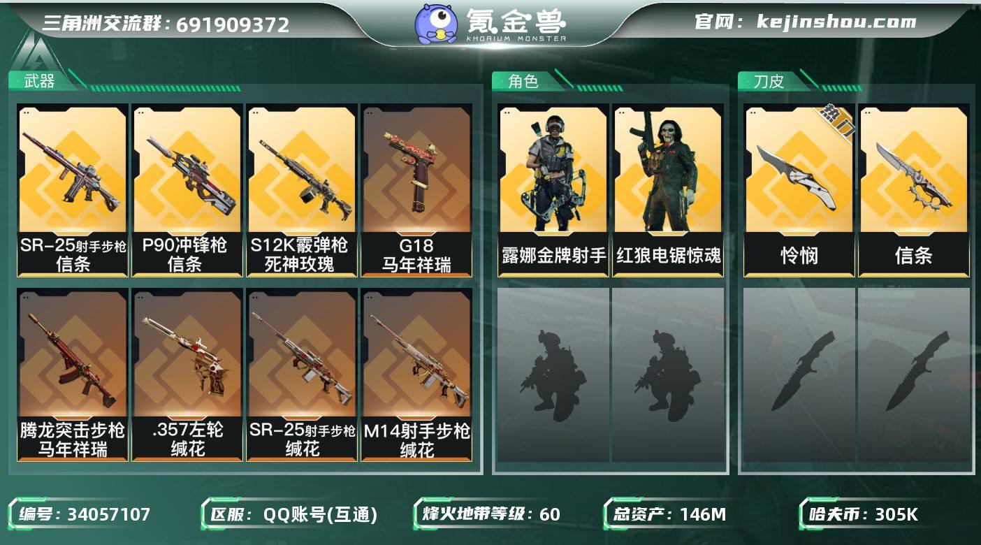 QJJ129/【特价极品号】可二次/QQ区服【总资产:149M/近战怜悯+近战信条+红狼电锯惊魂+S8赛季通行证已开+45发AWM子弹+仓库超多大红】/烽火等级:60级/全面战场:28级/纯币:305398/三角券加币:45(三角币45+三角券0)近战怜悯+近战信条+红狼电锯惊魂+S8赛季通行证已开+45发AWM子弹+仓库超多大红+特斯拉线圈捆绑包+马年祥瑞捆绑包+蛮荒捆绑包+缄花捆绑包+骑士捆绑包/部门:22212/特勤等级(技术中心3级/工作台3级/制药台3级/防具台3级/仓库7级/指挥中心5级/训练中心6级/靶场4级/潜水中心0级/收藏室0级/M4A1突击步枪-阿米娅/AK-12突击步枪-特斯拉线圈/SCAR-H战斗步枪-启航/SG552突击步枪-运动员/CAR-15突击步枪-阿米娅/腾龙突击步枪~马年祥瑞/AKC17突击步枪-电锯惊魂/P90冲锋枪-信条/Vector冲锋枪-能天使·午夜邮差/UZI冲锋枪-特斯拉线圈/SMG-45冲锋枪-骑士/SR-3M紧凑突击步枪-特斯拉线圈/橙色挂饰x3/段位:黑鹰IV(流动资产:136M)详情看图