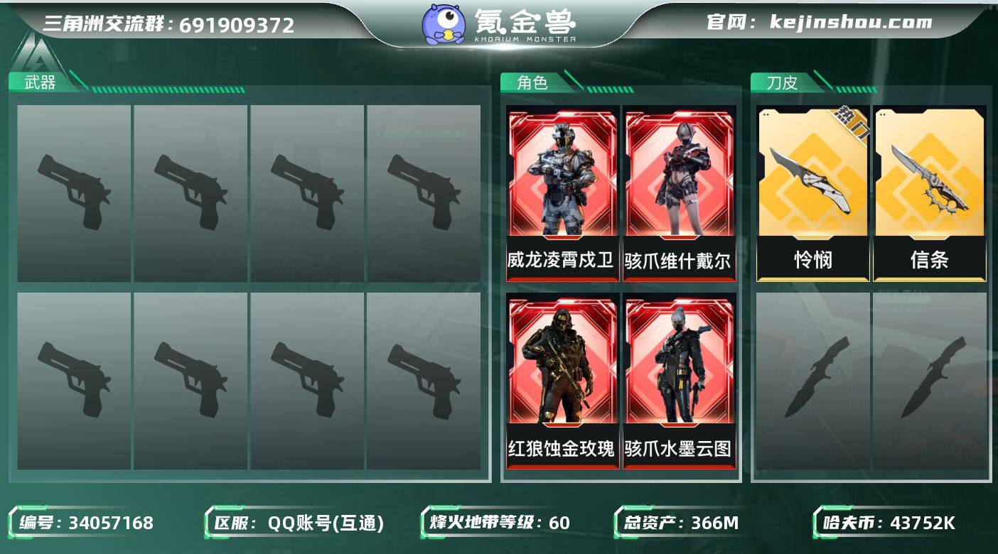 QJJ272/包人脸/QQ区服/0封禁【满体力满负重3刀4红骇爪全皮S9赛季顶级安全箱】【总资产:366M/近战怜悯+近战信条+近战处刑者(4级)+红狼蚀金玫瑰+威龙凌霄戍卫+骇爪水墨云图+骇爪维什戴尔+S9赛季3x3顶级安全箱+131发AWM子弹+仓库收藏室多大红】/烽火等级:60级/全面战场:14级/纯币:43752K/三角券加币:356(三角币3+三角券353)红狼电锯惊魂+乌鲁鲁荒原猎手+深蓝不破誓约+露娜金牌射手+锦绣捆绑包+悠然茶歇捆绑包+万金泪冠捆绑包+马年祥瑞捆绑包+缄花捆绑包+/部门:23332/特勤等级(技术中心3级/工作台3级/制药台3级/防具台3级/仓库7级/指挥中心5级/训练中心7级/靶场7级/潜水中心1级/收藏室1级)橙色挂饰x11/段位:黑鹰IV(流动资产:292M)详情看图,骇爪-水墨云图,红狼-蚀金玫瑰,骇爪-维什戴尔,威龙-凌霄戍卫,近战-怜悯,近战-信条,近战-处刑者4级