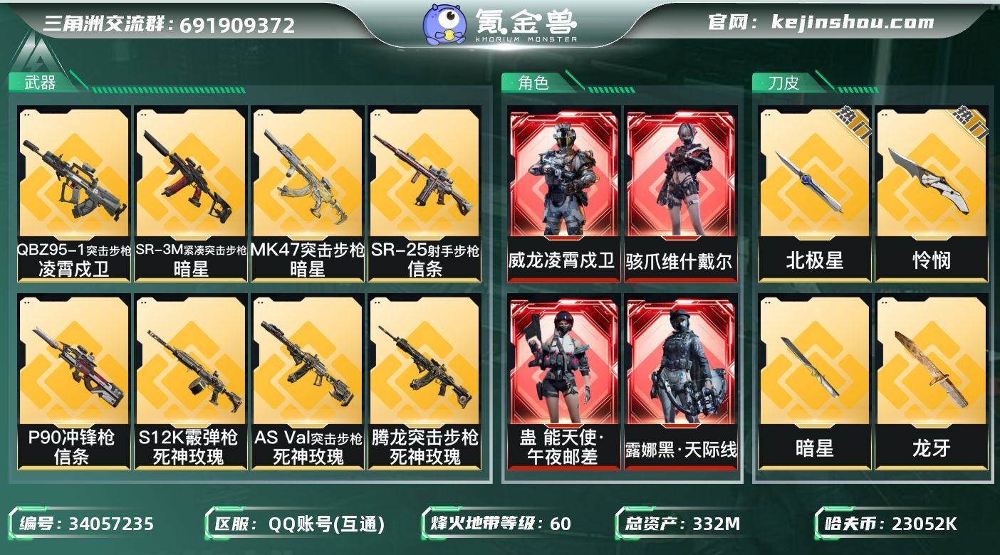 【sjz7728】332m总资产-23052k哈夫币-60烽火等级-钻石-24战场等级-上等兵 【干员外观】:红狼-蚀金玫瑰,骇爪-水墨云图,露娜-黑·天际线,蛊-能天使午夜邮差,骇爪-维什戴尔,威龙-凌霄戍卫,威龙-壮志凌云,蜂医-送葬人·无题密令,无名-夜鹰,深蓝-不破誓约,红狼-电锯惊魂,露娜-金牌射手,乌鲁鲁-荒原猎手,蛊-不羁人生 【近战皮肤】:近战-暗星,近战-北极星,近战-信条,近战-黑海,近战-怜悯,近战-龙牙,近战-黑鹰 【传说外观】:M4A1突击步枪-蚀金玫瑰,M4A1突击步枪-阿米娅,AKM突击步枪-锦绣,QBZ95-1突击步枪-凌霄戍卫,ASh-12战斗步枪-鹅鸭杀,SG552突击步枪-运动员,AK-12突击步枪-夜鹰,AK-12突击步枪-特斯拉线圈,SCAR-H战斗步枪-铁艺苍穹,SCAR-H战斗步枪-水墨云图,SCAR-H战斗步枪-启航,G3战斗步枪-骑士,CAR-15突击步枪-阿米娅,AS Val突击步枪-死神玫瑰,腾龙突击步枪-黎明警戒,腾龙突击步枪-捞点薯条,腾龙突击步枪-死神玫瑰,腾龙突击步枪-马年祥瑞,腾龙突击步枪-万金泪冠,K437突击步枪-猩红乐队,K437突击步枪-北极星,K437突击步枪-锦绣,KC17突击步枪-电锯惊魂,MK47突击步枪-暗星,MP5冲锋枪-黑海,P90冲锋枪-信条,Vector冲锋枪-能天使-午夜邮...