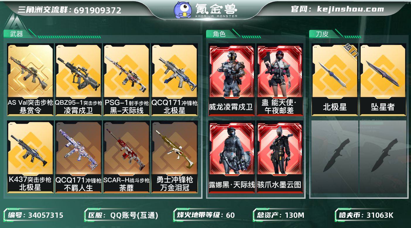 总资产:130.5M, 哈夫币:31063K ;总资产130M/哈夫币3106万/战场等级50/行动等级60/安全箱等时效性道具以游戏内数据为准,详情请看图 骇爪-水墨云图,露娜-黑·天际线,蛊-能天使午夜邮差,威龙-凌霄戍卫,蜂医-送葬人·无题密令,深蓝-不破誓约,红狼-电锯惊魂,露娜-金牌射手,乌鲁鲁-荒原猎手,近战-坠星者,近战-北极星,近战-黑鹰,AS Val突击步枪-悬赏令,M4A1突击步枪-阿米娅,AKM突击步枪-锦绣,QBZ95-1突击步枪-凌霄戍卫,SG552突击步枪-运动员,AK-12突击步枪-特斯拉线圈,SCAR-H战斗步枪-水墨云图,SCAR-H战斗步枪-启航,SCAR-H战斗步枪-荼蘼,G3战斗步枪-骑士,CAR-15突击步枪-阿米娅,腾龙突击步枪-捞点薯条,腾龙突击步枪-万金泪冠,K437突击步枪-北极星,K437突击步枪-锦绣,KC17突击步枪-电锯惊魂,Vector冲锋枪-能天使-午夜邮差,UZI冲锋枪-特斯拉线圈,SMG-45冲锋枪-锦绣,SR-3M紧凑突击步枪-特斯拉线圈,勇士冲锋枪-能天使-午夜邮差,勇士冲锋枪-万金泪冠,QCQ171冲锋枪-北极星,QCQ171冲锋枪-不羁人生,725双管霰弹枪-送葬人-无题密令,M250通用机枪-骑士之心,M14射手步枪-蛮荒,SKS射手步枪-骑士,PSG-1射手步枪-黑·天际线,AWM狙击步枪-捞点薯条,AWM狙击步枪-万金泪冠,93R-捞点薯条,复合弓-黑·天际...