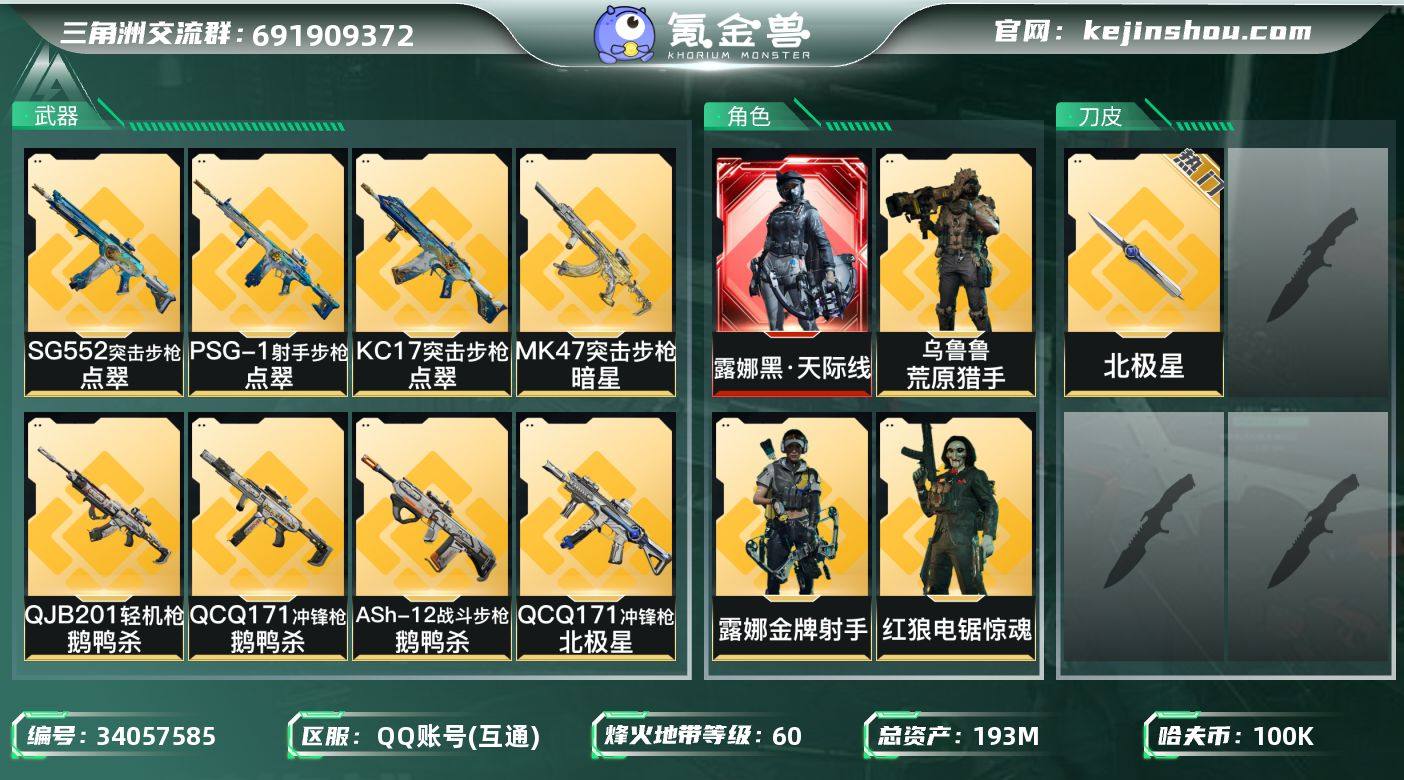 总资产193M/哈夫币10万/传说近战数2/干员外观数5/传说枪皮数40/战场等级20/行动等级60/安全箱等时效性道具以游戏内数据为准,详情请看图/露娜-黑·天际线/蜂医-送葬人·无题密令(S5)/红狼-电锯惊魂/露娜-金牌射手(S7)/乌鲁鲁-荒原猎手/近战-北极星/近战-处刑者2级/近战-黑鹰/M4A1突击步枪-蚀金玫瑰/M4A1突击步枪-阿米娅/ASh-12战斗步枪-鹅鸭杀/K416突击步枪-行动记录/M7战斗步枪-零度协议/SG552突击步枪-运动员/SG552突击步枪-点翠/AK-12突击步枪-特斯拉线圈/SCAR-H战斗步枪-启航/SCAR-H战斗步枪-荼蘼/G3战斗步枪-骑士/CAR-15突击步枪-阿米娅/AS Val突击步枪-蛇年祥瑞/腾龙突击步枪-捞点薯条/腾龙突击步枪-马年祥瑞/K437突击步枪-北极星/KC17突击步枪-电锯惊魂/KC17突击步枪-点翠/MK47突击步枪-暗星/UZI冲锋枪-特斯拉线圈/SR-3M紧凑突击步枪-特斯拉线圈/SR-3M紧凑突击步枪-荼蘼/勇士冲锋枪-能天使-午夜邮差/QCQ171冲锋枪-北极星/QCQ171冲锋枪-鹅鸭杀/725双管霰弹枪-送葬人-无题密令/PKM通用机枪-荼蘼/M250通用机枪-骑士之心/QJB201轻机枪-鹅鸭杀/M14射手步枪-蛮荒/M14射手步枪-缄花/SKS射手步枪-骑士/SR-25射手步枪-机动小队/SR-25射手步枪-缄花/PSG-1射手步枪-点翠/AWM狙击步枪...