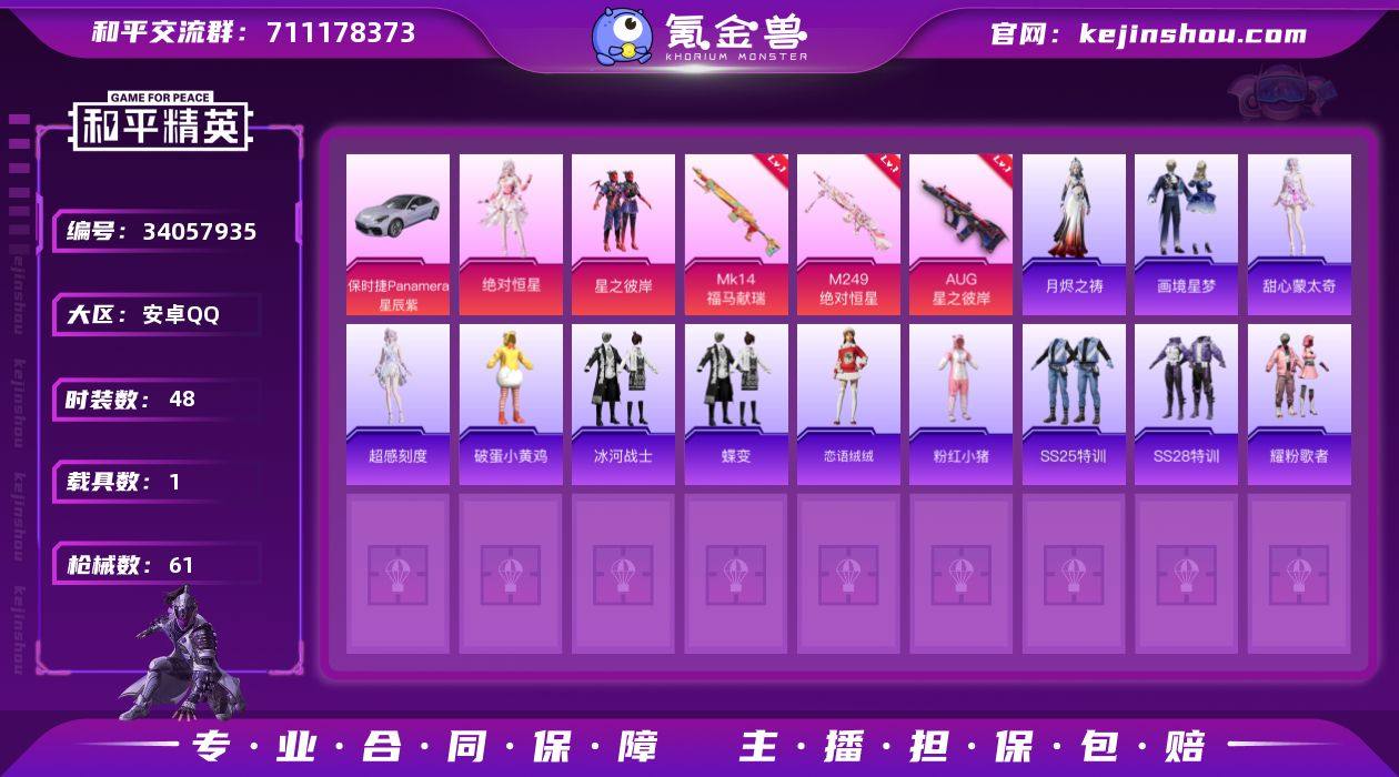 M1047980【AUG-星之彼岸[3级]1载具-2粉装-3特效枪】安卓手Q-1载具-2粉装-3特效枪-48套装-61枪皮-1王牌印记-坚韧铂金Ⅰ-21553热力值【1载具】保时捷Panamera(星辰紫)【2粉装】星之彼岸,角色-绝对恒星【3特效枪】AUG-星之彼岸[3级],M249-绝对恒星[7级],Mk14-福马献瑞[5级]【6飞行器】粉色滑翔尾迹,星之彼岸飞行器,登顶巅峰飞行器,荒原烈焰飞行器,马上有福飞行器,绝对恒星飞行器【104其它衣服和枪皮】红釉青花,角色-超感刻度,冰河战士,SS36特训,飞行日记,长空猛禽,SS35特训,耀粉歌者,牛气满满,疯狂小兔子,福马献瑞,街头风暴,SS37特训,星梦畅游,角色-月烬之祷,龙魂突击队,甜蜜熊情侣,缤纷果语,粉红小猪,琴音绮想,恋语绒绒,骑行爱好者,灿烂千阳,阳光火鸡,SS28特训,深蓝色名流,冷焰舞者,元素星魂,黑色伏地魔,马上有钱,蓝色运动,狙击之神,快乐星愿,SS31特训,SS25特训,雨过天青,角色-甜心蒙太奇,SS29特训,战术大师,柠萌假日,SS38特训,蝶变,雪国风尚,画境星梦,SS12特训,破蛋小黄鸡,GROZA-福马献瑞,M24-炫彩节奏,MP5K-画境星梦,AKM-星之彼岸,沙漠之鹰-雨过天青,AUG-绝对恒星,DBS-圣堂之誓,汤姆逊-天降萌叽,M1加兰德-画境星梦,S686-生命誓言,M249-破晓战魂,突击盾牌-绝对恒星,M416-蓝色火...