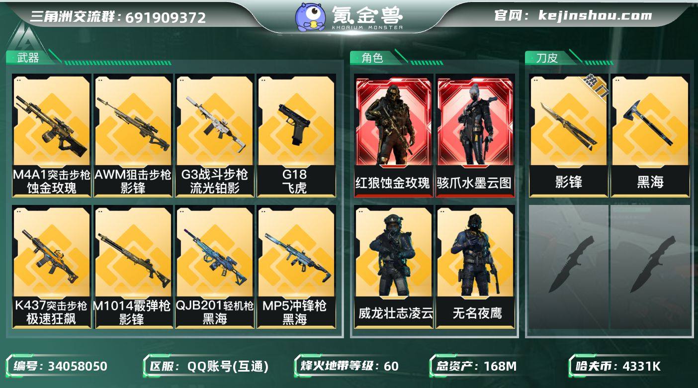 QJR211/包人脸/QQ区【总资产:168M+近战影锋+近战黑海+近战处刑者2级+红皮蚀金玫瑰+水墨云图+2颗非洲之心+32发AW+仓库大红多多+满体满负】【壮志凌云+夜鹰】/烽火等级:60/全面战场:29/纯币:4331K/三角券加币:648(210三角币+438三角券)//部门:33333/特勤等级(技术中心3级/工作台3级/制药台3级/防具台3级/仓库8级/指挥中心6级/训练中心7级/靶场7级/潜水中心3级/收藏室1级)---锦绣捆绑包---黑海捆绑包---茶扉捆绑包---缄花捆绑包---影锋捆绑包/橙色挂饰x6/流动资产:121M/详细看图 【热门藏品】:藏品-非洲之心