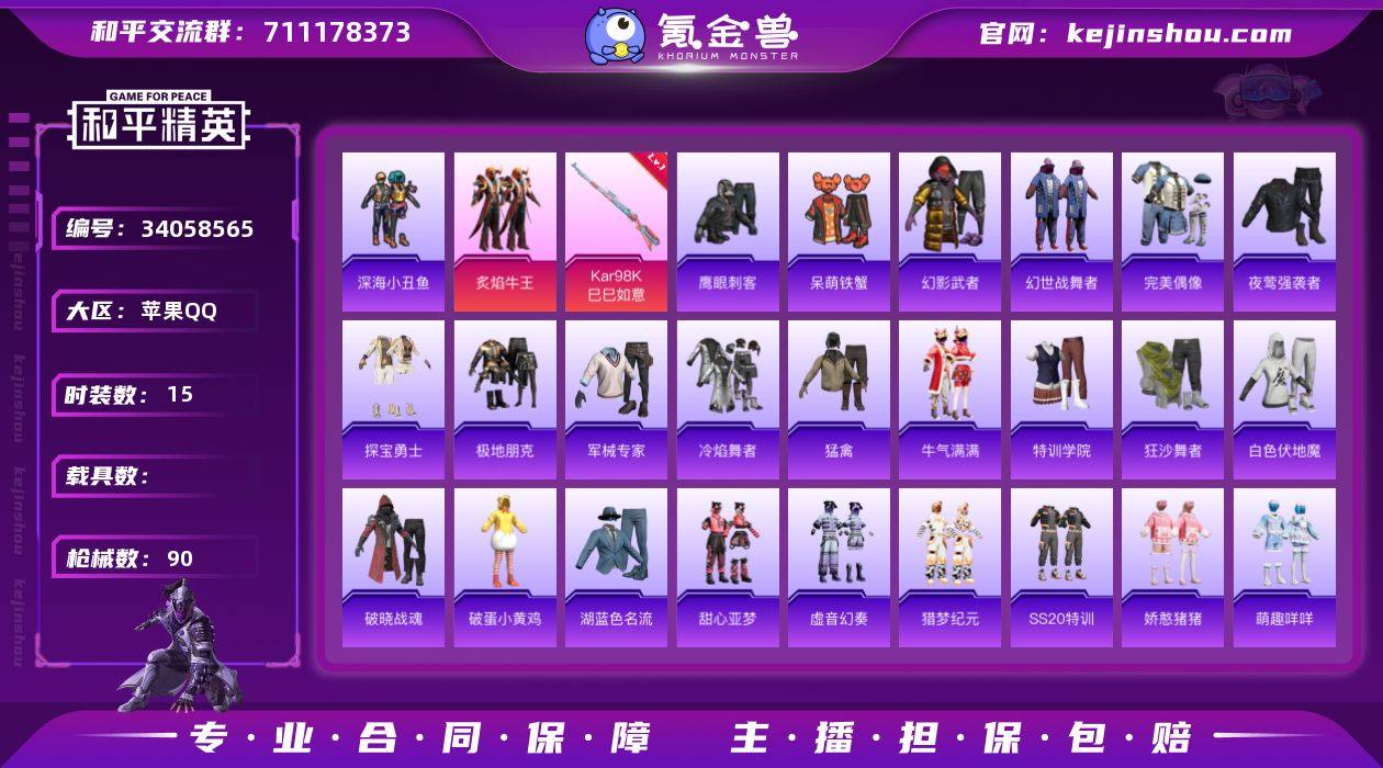 HX9675【深海小丑鱼-AG战队服-地铁42点天赋-粉装-炙焰牛王-3王牌印记-身法素材号】 苹果手Q-1粉装-2特效枪-26794热力值-3王牌印记-88套装-90枪皮 【热门品类】:套装-浪漫天命,套装-深海小丑鱼,套装-AG战队服,套装-龟仙人 【粉色套装】:粉装-炙焰牛王 【粉色枪皮等级】:Kar98K-巳巳如意(五级),Mk14-福马献瑞(五级) 【粉色枪皮】:Kar98K-巳巳如意,Mk14-福马献瑞 【粉色降落伞】:环太平洋降落伞,垂柳戏鸭降落伞,星穹咏叹调降落伞,冷漠罗丽降落伞苹果Q区-1粉装-2特效枪-26794热力值-3王牌印记-88套装-90枪皮【优质套装】: 炙焰牛王【特效枪等级】:Kar98K-巳巳如意(五级- Kar98K-巳巳如意)【优质武器皮肤】: Kar98K-巳巳如意【稀有武器皮肤】: Kar98K-巳巳如意 20-H-乌木金纹 蜜獾-乌木金纹 M416-红色方程式 AKM-影袭 AKM-生命誓言 AKM-破晓战魂 AKM-虎虎生威 SCAR-L-红色方程式 SCAR-L-炫彩节奏 M16A4-幻世战舞者 M16A4-甜心亚梦 GROZA-影袭 GROZA-田园牧歌 GROZA-懵萌河马 AUG-耀粉歌者 QBZ-彩虹符号 M762-彩虹符号 M762-天降萌叽 Mk47-乌木金纹 G36C-乌木金纹 G36C-懵萌河马 AC-VAL-天降萌叽 AC-VAL-甜心亚梦 AC-VAL-乌木金纹 蜜獾-天降萌叽 蜜獾-娇憨猪猪 M24...