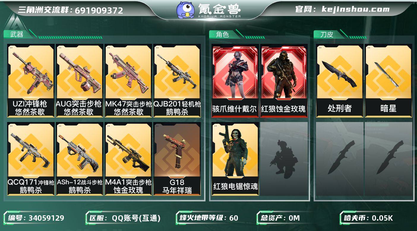 实名: 不可修改 烽火地带段位: 黄金 全面战场段位: 统帅 总资产: 217 哈夫币: 50 干员外观: 红狼-蚀金玫瑰,骇爪-维什戴尔,红狼-电锯惊魂 传说武器皮肤: M4A1突击步枪-蚀金玫瑰,SCAR-H战斗步枪-水墨云图,M4A1突击步枪-阿米娅,R93狙击步枪-维什戴尔,SCAR-H战斗步枪-启航,ASh-12战斗步枪-鹅鸭杀,QCQ171冲锋枪-鹅鸭杀,QJB201轻机枪-鹅鸭杀,近战-暗星,近战-处刑者,M14射手步枪-蛮荒,K416突击步枪-行动记录,腾龙突击步枪-马年祥瑞,G18-马年祥瑞,PKM通用机枪-荼蘼,勇士冲锋枪-万金泪冠,腾龙突击步枪-万金泪冠,AWM狙击步枪-万金泪冠,MK47突击步枪-悠然茶歇,AUG突击步枪-悠然茶歇,UZI冲锋枪-悠然茶歇