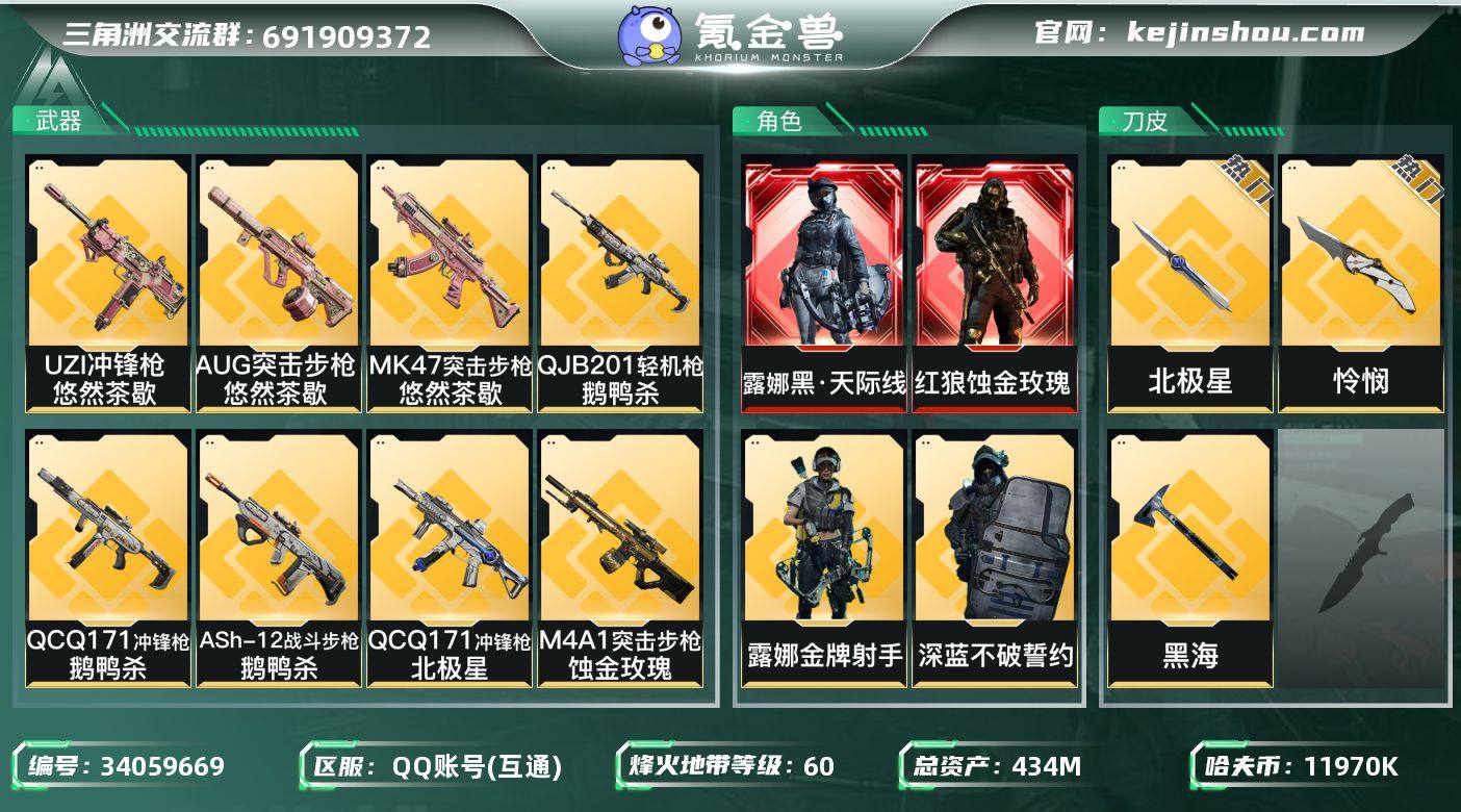 总资产434M/哈夫币1197万/传说近战数3/干员外观数6/传说枪皮数31/战场等级1/行动等级60/安全箱等时效性道具以游戏内数据为准,详情请看图/红狼-蚀金玫瑰/露娜-黑·天际线/蜂医-送葬人·无题密令(S5)/无名-夜鹰(S4)/深蓝-不破誓约(S6)/露娜-金牌射手(S7)/近战-北极星/近战-黑海/近战-怜悯/近战-黑鹰/M4A1突击步枪-蚀金玫瑰/M4A1突击步枪-阿米娅/AKM突击步枪-锦绣/ASh-12战斗步枪-鹅鸭杀/K416突击步枪-行动记录/AUG突击步枪-悠然茶歇/SG552突击步枪-运动员/AK-12突击步枪-夜鹰/AK-12突击步枪-特斯拉线圈/SCAR-H战斗步枪-启航/CAR-15突击步枪-黑鹰坠落/腾龙突击步枪-捞点薯条/K437突击步枪-北极星/K437突击步枪-锦绣/MK47突击步枪-悠然茶歇/UZI冲锋枪-特斯拉线圈/UZI冲锋枪-悠然茶歇/SMG45冲锋枪-骑士/SMG-45冲锋枪-锦绣/SR-3M紧凑突击步枪-特斯拉线圈/勇士冲锋枪-能天使-午夜邮差/QCQ171冲锋枪-北极星/QCQ171冲锋枪-鹅鸭杀/725双管霰弹枪-送葬人-无题密令/PKM通用机枪-荼蘼/M250通用机枪-骑士之心/QJB201轻机枪-鹅鸭杀/M14射手步枪-蛮荒/AWM狙击步枪-捞点薯条/93R-捞点薯条/复合弓-黑-天际线/KC17突击步枪-碎冰行动(典藏)/AKM突击步枪-林中猎手/Ash-12战斗步枪-守夜人/ASh-12战斗...