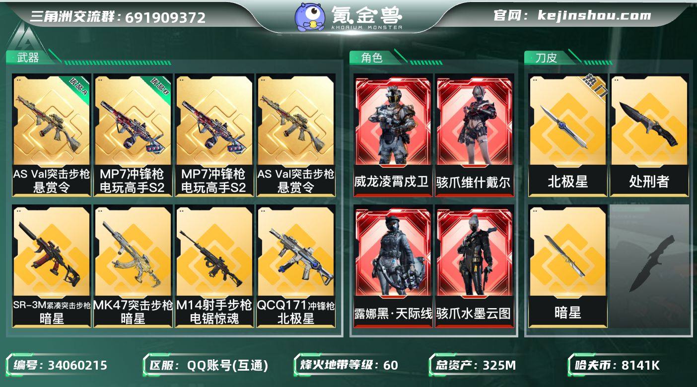 A13132包人脸/QQ区【总资产:325.2M+巨浪(优品A)+MP7电玩高手S2(优品B)+近战北极星+近战暗星+近战处刑者+威龙凌霄戍卫+骇爪维什戴尔+骇爪水墨云图+露娜黑天际线+仓库9+体力负重满+非洲之心+守信不渝】/烽火等级:60级/全面战场:45级/纯币:8141K/三角券加币:55(三角币30+三角券25)【优品A-AS Val突击步枪-悬赏令/优品B-MP7冲锋枪-电玩高手S2】【近战-北极星/近战-暗星/近战-处刑者】【威龙-凌霄戍卫/骇爪-维什戴尔/骇爪-水墨云图/露娜-黑天际线】蜂医-无题密令/无名-夜鹰/乌鲁鲁-荒原猎手/蛊-不羁人生/露娜-金牌射手/部门:33333/特勤等级(技术中心3级/工作台3级/制药台3级/防具台3级/仓库9级/指挥中心6级/训练中心7级/靶场7级/潜水中心级1/收藏室1级)R93狙击步枪-维什戴尔/M14射手步枪-电锯惊魂/QCQ171冲锋枪-北极星/K437突击步枪-北极星/SR-3M紧凑突击步枪-暗星/MK47突击步枪-暗星/橙色挂饰x9/段位:钻石(流动资产:264.3M)/详细看图 ,MP7冲锋枪-电玩高手S2,AS Val突击步枪-悬赏令,近战-暗星,近战-北极星,近战-处刑者1级,MP7冲锋枪-电玩高手S2(优品B),AS Val突击步枪-悬赏令(优品A)