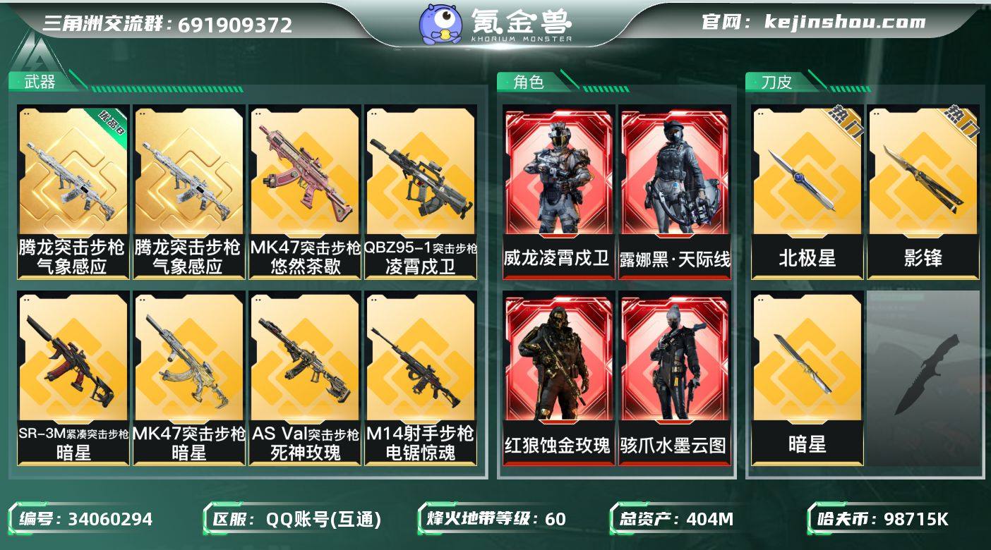 A13165/包人脸/QQ区【总资产:404M+腾龙气象感应(优品B/冰)+近战北极星+近战影锋+近战暗星+红狼蚀金玫瑰+威龙凌霄戍卫+骇爪水墨云图+露娜黑天际线+威龙飞虎+蜂医危险物质+部门全4+仓库10满体满负+83发AW子弹】/烽火等级:60级/全面战场:27级/纯币:98715K/三角券加币:159(三角币79+三角券80)【近战-北极星/近战-影锋/近战-暗星】【红狼-蚀金玫瑰/威龙-凌霄戍卫/骇爪-水墨云图/露娜-黑天际线】【威龙-飞虎/威龙-壮志凌云/威龙-蛟龙特战队/蜂医-危险物质/深蓝-不破誓约/无名-夜鹰/蜂医-送葬人无题密令/蛊-不羁人生】/部门:44444/特勤等级(技术中心3级/工作台3级/制药台3级/防具台3级/仓库10级/指挥中心6级/训练中心7级/靶场7级/潜水中心1级)(流动资产:348.3M)M4A1突击步枪-蚀金玫瑰/QBZ95-1突击步枪-凌霄戍卫/SCAR-H战斗步枪-水墨云图/K437突击步枪-北极星/SR-3M紧凑突击步枪-暗星/MK47突击步枪-暗星/AWM狙击步枪-影锋/橙色挂饰x9/段位:黄金IV/详细看图