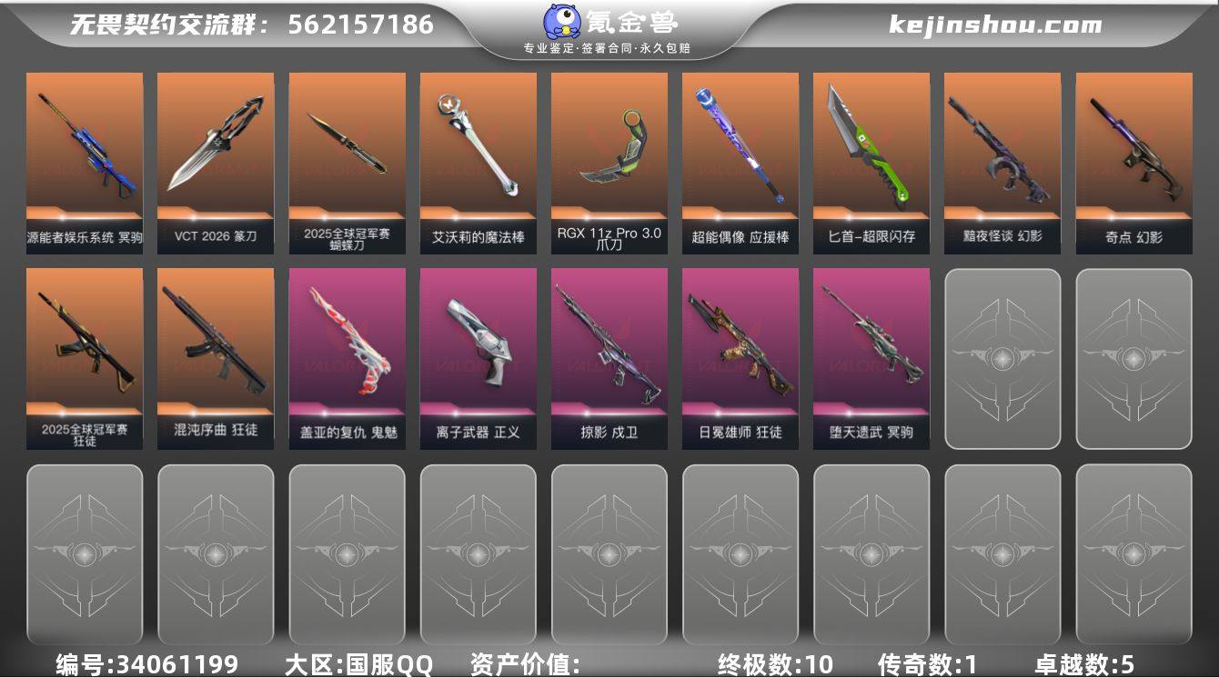 【套装】:2025全球冠军赛套装,VCT 2026 赛季套装 【英雄】:幻棱,炼狱,维斯,暮蝶,钛狐,壹决,铁臂,捷风,雷兹,幽影,不死鸟,贤者,猎枭,蝰蛇,零,芮娜,奇乐,尚勃勒,霓虹,斯凯,夜露,星礈,K/O,海神,盖可,黑梦,钢锁 【近战武器】:近战武器-2025全球冠军赛 蝴蝶刀,近战武器-VCT 2026 篆刀,近战武器-RGX 11z Pro//3.0 爪刀,近战武器-艾沃莉的魔法棒,近战武器-超能偶像 应援棒,近战武器-超限闪存 匕首 【狂徒】:狂徒-2025全球冠军赛,狂徒-混沌序曲,狂徒-日冕雄师,狂徒-超能偶像 【幻影】:幻影-黯夜怪谈,幻影-奇点,幻影-超限闪存,幻影-聚合之力 【戍卫】:戍卫-掠影,戍卫-超能偶像,戍卫-浮光跃金 【獠犬】:獠犬-采蜜小蜂队,獠犬-模拟赫兹 【冥驹】:冥驹-源能者娱乐系统,冥驹-堕天遗武,冥驹-模拟赫兹 【飞将】:飞将-聚合之力 【莽侠】:莽侠-超限闪存 【战神】:战神-采蜜小蜂队,战神-浮光跃金 【判官】:判官-超能偶像,判官-采蜜小蜂队 【雄鹿】:雄鹿-模拟赫兹 【骇灵】:骇灵-浮光跃金 【蜂刺】:蜂刺-超限闪存,蜂刺-聚合之力 【标配】:标配-超能偶像,标配-浮光跃金 【正义】:正义-离子武器,正义-超限闪存,正义-纳米打击 【...