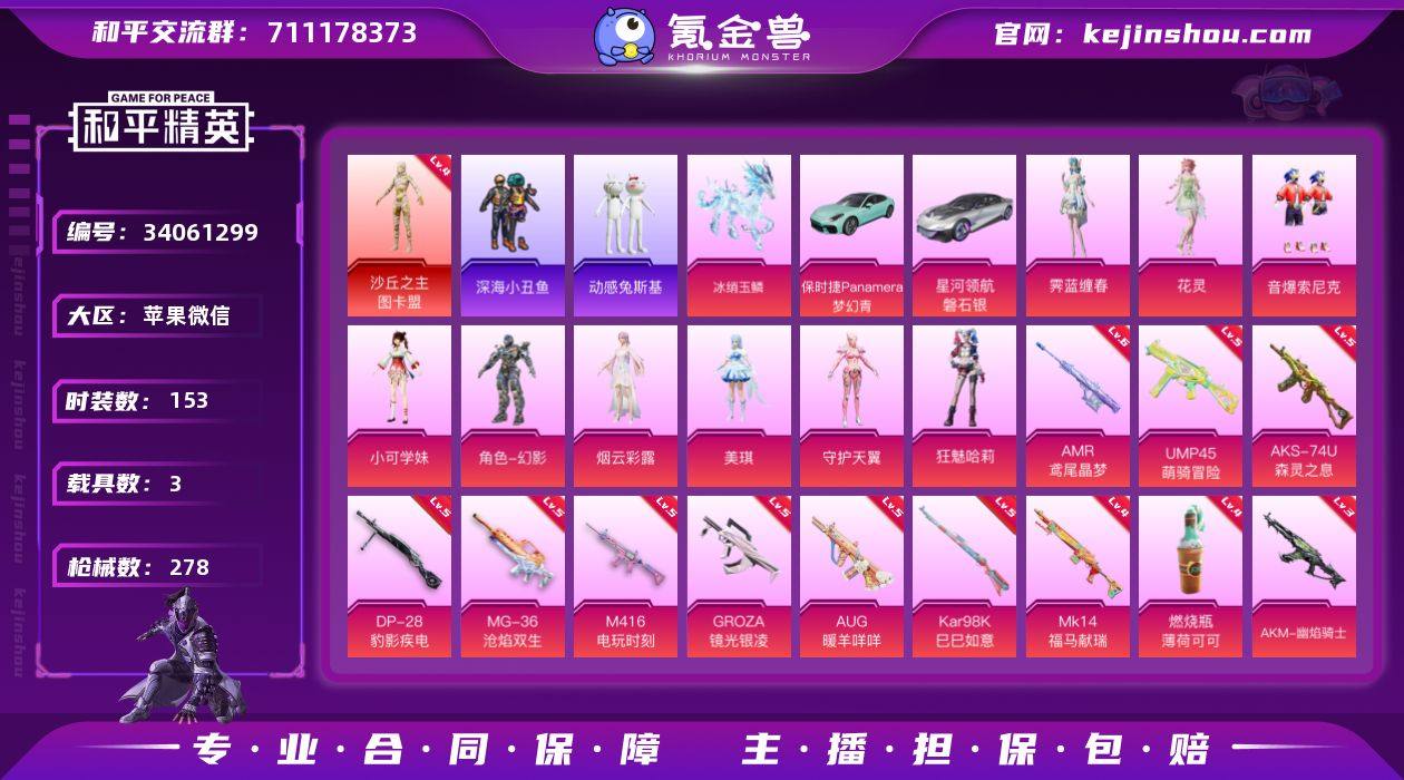 4级图卡盟!AG战队服!蓝螳螂 女小丑!3载具!苹果微信-1神装-10粉装-14特效枪-3载具-13粉色飞行器-86718热力值-15王牌印记-153套装-278枪皮 【红色神装等级】:沙丘之主-图卡盟(四级) 【红色角色神装】:沙丘之主-图卡盟 【热门品类】:粉装-音爆索尼克,套装-深海小丑鱼,套装-小丑鱼,套装-动感兔斯基人偶服,套装-AG战队服,套装-龟仙人,角色-Mark.06 【粉色套装】:粉装-音爆索尼克,角色-小可学妹,角色-幻影,角色-烟云彩露,角色-美琪,角色-守护天翼,角色-狂魅哈莉,角色-花灵,角色-霁蓝缠春 【粉色枪皮等级】:AKM-幽焰骑士(三级),M416-电玩时刻(五级),M416-墨龙九天(三级),GROZA-镜光银凌(五级),AUG-暖羊咩咩(五级),UMP45-量子极限(一级),UMP45-萌骑冒险(五级),AKS-74U-森灵之息(五级),Kar98K-巳巳如意(五级),Mk14-福马献瑞(四级),AMR-鸢尾晶梦(六级),DP-28-豹影疾电(五级),MG-36-沧焰双生(五级),燃烧瓶-薄荷可可(四级) 【粉色载具】:星河领航(磐石银),保时捷Panamera(梦幻青),冰绡玉鳞 【粉色枪皮】:AKM-幽焰骑士,M416-电玩时刻,M416-墨龙九天,GROZA-镜光银凌,AUG-暖羊咩咩,UMP45-量子极限,UMP45-萌骑冒险,AKS-74U-森灵之息,Kar9...