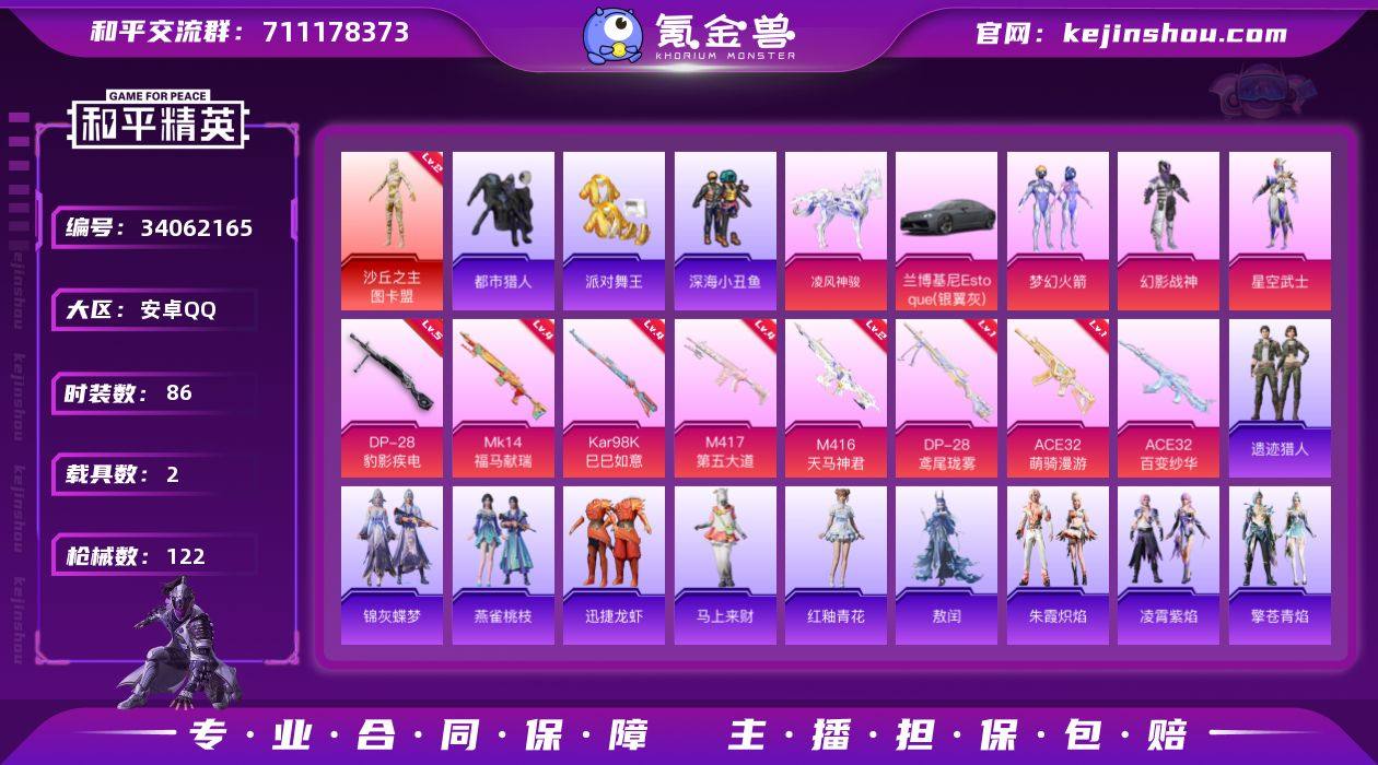 安卓手Q-1神装-3粉装-8特效枪-2载具-4粉色飞行器-36745热力值-5王牌印记-86套装-122枪皮 【红色神装等级】:沙丘之主-图卡盟(二级) 【红色角色神装】:沙丘之主-图卡盟 【热门品类】:粉装-梦幻火箭,套装-浪漫天命,套装-都市猎人,套装-派对舞王,套装-深海小丑鱼,角色-六号稻草人 【粉色套装】:粉装-幻影战神,粉装-梦幻火箭,角色-星空武士 【粉色枪皮等级】:M416-天马神君(二级),ACE32-萌骑漫游(一级),Kar98K-巳巳如意(四级),Mk14-福马献瑞(四级),M417-第五大道(四级),DP-28-豹影疾电(五级),DP-28-鸢尾珑雾(一级) 【粉色载具】:兰博基尼Estoque(银翼灰),凌风神骏 【粉色枪皮】:M416-天马神君,ACE32-萌骑漫游,ACE32-百变纱华,Kar98K-巳巳如意,Mk14-福马献瑞,M417-第五大道,DP-28-豹影疾电,DP-28-鸢尾珑雾 【粉色飞行器】:沙丘之主天马,繁龙极客飞行器,踏卷乘风飞行器,纱华羽翼飞行器 【粉色降落伞】:梦幻火箭降落伞,智耀战神降落伞,星穹咏叹调降落伞,天马神君降落伞,鸢尾珑雾降落伞,百变纱华降落伞 【稀有套装】:套装-小鸟芋圆,套装-马上来财,套装-迅捷龙虾,套装-遗迹猎人,套装-粉恋花,套装-紫幽梦,套装-蓝冰羽,角色-六号稻草人,...