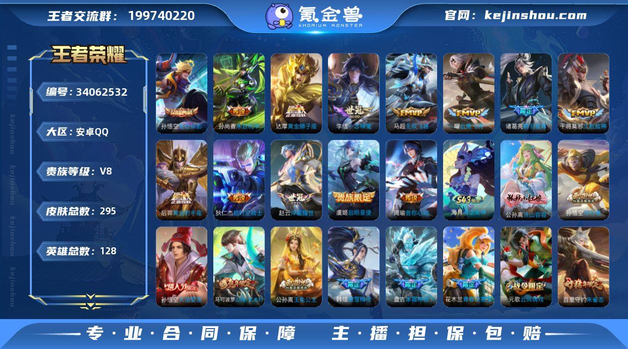 实名: 可修改 性别: 男号 贵族等级: V8 英雄数: 128 皮肤数: 295 荣耀水晶: 全息碎影 传说皮: 黄金狮子座,黄金射手座,云鹰飞将,久胜战神,一念神魔,末日机甲-孙尚香,音你心动-周瑜,淬星耀世,超时空战士-狄仁杰,无双飞将,鹤羽星尊 限定皮: 李小龙,梁祝,青春决赛季,朱雀志,如梦令-后羿,大圣娶亲,高山流水,孙行者,匿光追影者,傲雪梅枪,玉兔公主,五谷丰年,山海·玄木吟,冰霜神祇 亮点: 【优质装备】:全息碎影(猴子典藏),黄金狮子座,黄金射手座,云鹰飞将(小将军),久胜战神,一念神魔,末日机甲-孙尚香(绿蚂蚱),音你心动-周瑜,淬星耀世,超时空战士-狄仁杰,无双飞将,鹤羽星尊,涂山容容