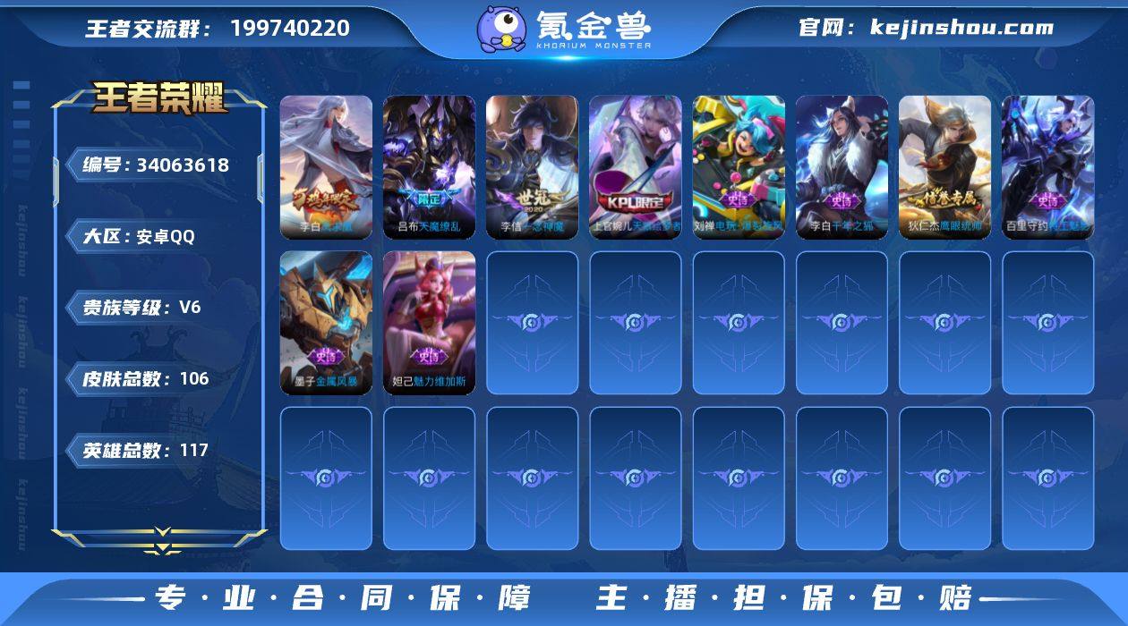 V6 3传说 117英雄 106皮肤 可二次 可修改实名 女号