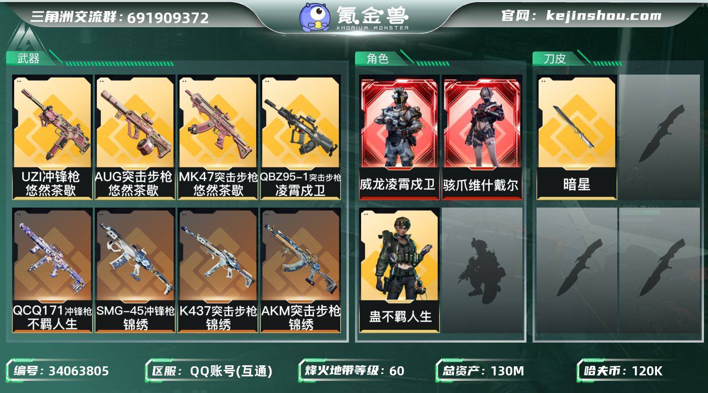 总资产130M/哈夫币12万/传说近战数1/干员外观数3/传说枪皮数19/战场等级21/行动等级60/安全箱等时效性道具以游戏内数据为准,详情请看图/骇爪-维什戴尔/威龙-凌霄戍卫/蛊-不羁人生/近战-暗星/近战-黑鹰/M4A1突击步枪-阿米娅/AKM突击步枪-锦绣/QBZ95-1突击步枪-凌霄戍卫/AUG突击步枪-悠然茶歇/AK-12突击步枪-特斯拉线圈/SCAR-H战斗步枪-启航/CAR-15突击步枪-阿米娅/腾龙突击步枪-捞点薯条/K437突击步枪-锦绣/MK47突击步枪-悠然茶歇/UZI冲锋枪-特斯拉线圈/UZI冲锋枪-悠然茶歇/SMG-45冲锋枪-锦绣/SR-3M紧凑突击步枪-特斯拉线圈/勇士冲锋枪-能天使-午夜邮差/QCQ171冲锋枪-不羁人生/R93狙击步枪-维什戴尔/AWM狙击步枪-捞点薯条/93R-捞点薯条/K416突击步枪-阿萨拉特攻/SG552突击步枪-深海恐惧/SCAR-H战斗步枪-囚徒/腾龙突击步枪-猎鳄行动/MP5冲锋枪-深海恐惧/P90冲锋枪-紧急戒备/SR-3M紧凑突击步枪-战术竞备/MP7冲锋枪-六套之力/QJB201轻机枪-炽焰/QJB201轻机枪-Old Habits/SV-98狙击步枪-林中猎手/SCAR-H战斗步枪-旧梦/AKS-74U突击步枪-休闲时光/SVD狙击步枪-酸蚀/SG552突击步枪-贴花艺术/ AK-12突击步枪-马年新春/SCAR-H战斗步枪-荣耀列队/SCAR-H战斗步枪-开心时刻/AS Val突击步枪...