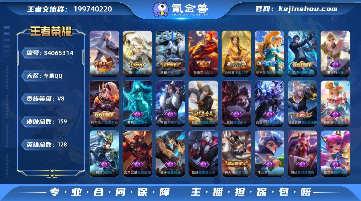 英雄 159皮肤 典藏英雄武则天 可二次 可修改实名 男号 【英雄全皮】大禹全皮 【稀有英雄】大司命,嬴政(始皇帝),韩信(韩跳跳),夏洛特(夏师傅),艾琳,橘右京(橘子),娜可露露(鸟人),不知火舞,赵云,金蝉(唐僧),戈娅 【传说皮】地狱火,炽阳神光,无双飞将 【赛季/战令皮】噬灭天穹(s37),古海寻踪(s33),海盐诗旅(s30),擒涛扼浪(s31),探海日志(s32),玲珑珍味,天穹祈灯(s34),狮心王(s3),凯尔特女王(s7),狰(s8),饕餮(s9),烛龙(s10),重明(s11),穷奇(s12),御狮(s13),御霄(s14),疑决卦(s19),醍醐杖(s20),原初探秘者(s21),万华元夜(s22),演武夺筹(s23),千军破阵(s25),猎兽之王,沙漠行僧(s26),金庭之子(s27),大漠名商(s28),云中旅人(s29) 【史诗皮】海之女神,紫霞仙子,白龙吟,特工魅影,千年之狐,永昼,冰冠公主,偶像歌手,水果甜心,星夜王子,幽灵船长,鬼剑武藏,舞动绿茵,逐浪之夏,水晶猎龙者,曙光守护者,金属风暴,原初追逐者,鹰眼统帅,王者之锤,暗夜贵公子,魅力维加斯 【限定皮】凤求凰(白切鸡),五谷丰年,游园惊梦,逐梦之翼,李小龙,青春决赛季,玉兔公主 【普通皮】雾都夜雨,功夫炙烤,街头霸王,聚星闪耀,危途狂花,王牌新星,鬼谷子天穹祈灯(S34),破局者,威尼斯狂欢,尼罗河女神,完美运算,胡桃狂想...