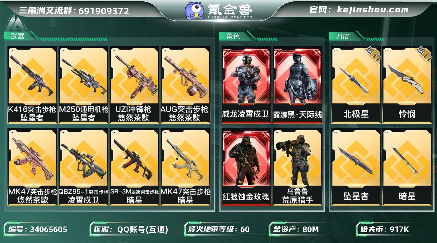 总资产80M/哈夫币91万/传说近战数5/干员外观数6/传说枪皮数33/战场等级20/行动等级60/安全箱等时效性道具以游戏内数据为准,详情请看图/红狼-蚀金玫瑰/露娜-黑·天际线/威龙-凌霄戍卫/红狼-电锯惊魂/露娜-金牌射手(S7)/乌鲁鲁-荒原猎手/近战-坠星者/近战-暗星/近战-北极星/近战-信条/近战-怜悯/近战-黑鹰/M4A1突击步枪-蚀金玫瑰/M4A1突击步枪-阿米娅/QBZ95-1突击步枪-凌霄戍卫/K416突击步枪-坠星者/AUG突击步枪-悠然茶歇/SG552突击步枪-运动员/AK-12突击步枪-特斯拉线圈/SCAR-H战斗步枪-启航/腾龙突击步枪-捞点薯条/K437突击步枪-北极星/MK47突击步枪-悠然茶歇/MK47突击步枪-暗星/P90冲锋枪-信条/UZI冲锋枪-特斯拉线圈/UZI冲锋枪-悠然茶歇/SMG45冲锋枪-骑士/SMG-45冲锋枪-锦绣/SR-3M紧凑突击步枪-特斯拉线圈/SR-3M紧凑突击步枪-暗星/勇士冲锋枪-能天使-午夜邮差/QCQ171冲锋枪-北极星/QCQ171冲锋枪-不羁人生/MK4冲锋枪-夜莺/M250通用机枪-坠星者/M14射手步枪-蛮荒/M14射手步枪-缄花/SKS射手步枪-骑士/SR-25射手步枪-信条/SR-25射手步枪-缄花/AWM狙击步枪-捞点薯条/.357左轮-缄花/93R-捞点薯条/复合弓-黑-天际线/P90冲锋枪-天命(典藏)/AKM突击步枪-林中猎手/QBZ95-1突击步枪-曙光...