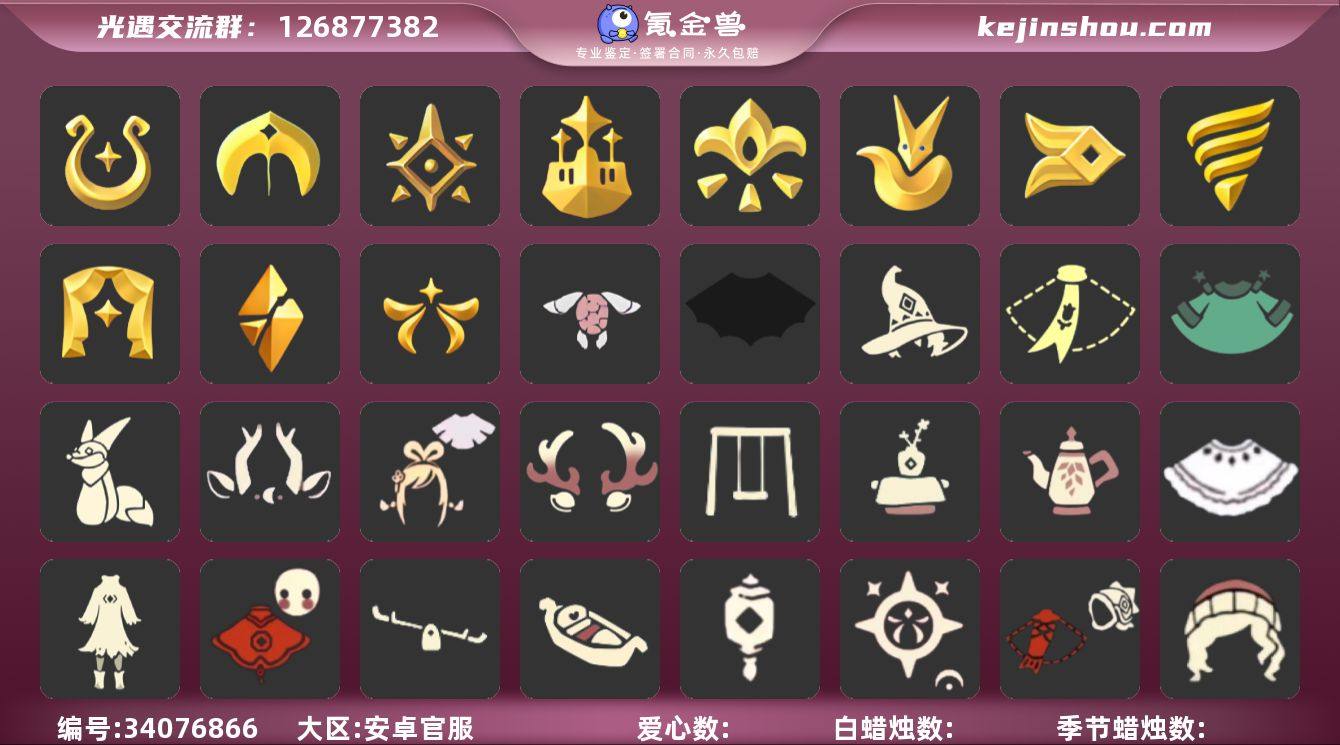 账号类型: 手机账号 季节已毕业: 魔法季,圣岛季,预言季,梦想季,小王子季,风行季,潜海季,表演季,破晓季,欧若拉季,集结季 完成地图: 晨岛,云野,雨林,霞谷,暮土,禁阁,全图毕业 珍稀物品: 阿努比斯(狗头),白枭,透明蝶翼斗,魔法季耳坠,玫瑰花 礼包: 蝙蝠套,巫师,围巾,星球斗,小狐狸,九色鹿角,绊爱,鹿角,秋千,茶桌,茶壶,白绒金,女巫裙,福娃,跷跷板,小船,灯笼,人声乐器,鲤鱼套,彩虹帽,雪花球,绒帽,橘子,贝壳,黄伞,红伞,兔子,南瓜,枯角,雪花,鲤鱼,水母,彩虹耳钉,彩虹耳机,新年裤,四叶草,暗彩装扮,文雀套,创始人,锦标赛短袍,锦标赛桂冠,线框斗,海龟斗篷 裤子: 武士裤,背带裤,白棉裤,搓澡巾 面具: 黄鼠狼,红狐狸,阿努比斯 面饰: 魔法季耳坠,红耳机 项链: 围巾 发型: 蝴蝶结,正太,樱花,公主头,虚荣,猫耳,白枭 头饰: 花环 斗篷: 白金,红金,白鸟斗,花瓣斗篷,荧蓝斗篷 配饰: 雨伞,排箫,高音钢琴,吉他,笛子,大铃铛乐器,乐器
