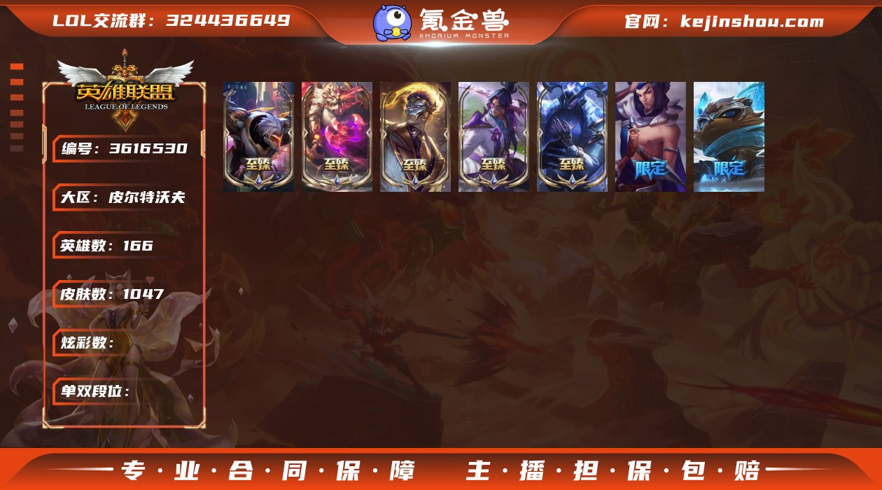 166英雄-1047皮肤-409炫彩-段位:青铜 至臻-至高天-奎桑提 至臻-神龙尊者-炎龙瑟提 至臻-心之钢-永恩 至臻-神凰行者-烈羽焰凰-霞 至臻-DRX-亚托克斯 至臻-腥红之月-亚托克斯-(2022) 至臻-腥红之月-亚托克斯 至臻-真实伤害-奇亚娜 至臻-星之守护者-艾克 至臻-源计划:阴-劫 至臻-幻灵战斗猫-金克丝 至臻-真实伤害-亚索 至臻-K/DA-ALL-OUT-卡莎 至臻-魔女-婕拉 至臻-黑夜使者-凯隐 至臻-星之守护者-辛德拉 至臻-女帝-黛安娜 至臻-太空律动-“节奏幻师”-璐璐 至臻-神龙尊者-均衡之龙-沃利贝尔 至臻-绒毛菲兹-(2022) 至臻-绒毛菲兹 至臻-战斗学院-拉克丝 至臻-玉剑传说-武剑仙 至臻-灵能特工-伊泽瑞尔 至臻-飞升战神-潘森 至臻-烈焰美人-薇恩 至臻-焰执事-布兰德 至臻-源计划:正义-艾瑞莉娅 至臻-玉剑传说-琴仙子 至臻-魅惑女巫-厄运小姐 至臻-灵魂莲华-易 至臻-魔女-乐芙兰 零之枪骑-赫卡里姆 海克斯科技-吉格斯 摄魂使者-薇恩 海克斯科技-嘉文四世 海克斯科技-雷克顿 海克斯科技-崔丝塔娜 海克斯科技-安妮 十周年纪念-安妮 神凰行者-瑞羽圣凰-艾尼维亚 源代码-乐芙兰 都铎王朝-图奇 暗影-沃里克 密林猎手-提莫 防暴天使-凯尔 电玩战魂-赫卡里姆 野兽猎人-德莱文 奥德赛-吉格斯 野兽猎人-瑟庄妮 防暴士兵-格雷福斯 玉剑传说-舞龙卫 冰原核弹-古拉加斯 波比的巧克力工坊 警用试作体K-9-内瑟斯 黎明使者-薇恩 制胜金靴-李青 防暴机器人-布里茨 外星装甲-库奇 钢铁之翼-艾尼维亚 制胜金球-拉莫斯 惊悚派对-阿木木 养蜂人-辛吉德 防暴士兵-辛吉德 奥斯曼大帝-泰达米尔 创战纪-希维尔 斩星魔剑-易 玉剑传说-翼剑仙 糖果使徒-费德提克 诺斯费拉图--弗拉基米尔 蓝色忧郁-崔斯特 鸡里奥 机械迷城-加里奥 虎痴之拳-蔚 纳财大帝-塔姆 神龙烈焰-金克丝 广寒仙子-嫦娥 王国机神青龙-德莱文 金猪烈焰-瑟庄妮 替父从军-花木兰 王国机神玄武-盖伦 张辽-文远 北辰之威-内瑟斯 碧玉之牙-卡西奥佩娅 龙的传人-李青 美猴王-孙悟空 神龙之翼-库奇 剪纸仙灵-艾瑞莉娅 古琴余韵-娑娜 紫金罗刹-莫甘娜 王国机神白虎-贾克斯 招财进宝-提莫 福牛守护者-阿利斯塔 福牛守护者-安妮 “你看见过