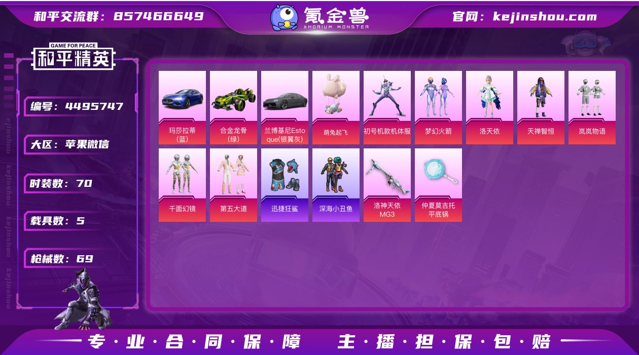 1107926苹果微信可二次实名王者印记:6套装数量:70枪皮数量:69稀有时装:紫螳螂,梦幻火箭,洛天依,天禅智恒,岚岚物语,深海小丑鱼,迅捷狂鲨,近战武器-偃月,近战武器-灼骨锤,近战武器-王国工设军刀,近战武器-洪荒双斩,近战武器-硅晶刻刀,近战武器-命运权杖,标配-堕天遗武,标配-杀毒执行,标配-涂鸦艺廊,短炮-梦魇恶魔,短炮-弧光异彩,狂怒-金角生辉,狂怒-水印纹理,鬼魅-信手涂鸦,正义-781-A协议,正义-维和者,正义-游戏结束,标配-VCTxG2,标配-VCTxFNC,标配-VCTxGEN,蜂刺-天界神兵,蜂刺-真皮沙发,蜂刺-电光霓虹,蜂刺-赛博奇兵,冲锋枪 骇灵,骇灵-洪荒怒焰,骇灵-奇幻朋克,骇灵-打击力量,雄鹿-异形猎人,雄鹿-匠心瓷绘,雄鹿-激流先锋,判官-数码咒术,步枪 戍卫,戍卫-幽海幻潮,幻影-灵魂冲击,幻影-九命灵猫,幻影-幽海幻潮,狂徒-洪荒怒焰,狂徒-起源,狂徒-猩红猛兽,狂徒-无畏契约go第二卷,狂徒-皓月幽森,狂徒-狼人猎手,狂徒-漫天彩霞,狂徒-赛博奇兵稀有载具:玛莎拉蒂Q蓝色,兰博轿车灰色,合金龙骨绿色,萌兔起飞僚机,狂徒-MKVII自由强袭,飞将-月光灵狐稀有枪械:AKM-缤纷海域,MG3-洛神天依,战神-无畏契约go第二卷,战神-炽红快攻,战神-本色混搭,战神-泰坦兵器,战神-沙场老兵,奥丁-特战队眼镜蛇,奥丁-凌云天纵,全服,威严将相,DBS-黑白懵懵牛,冰暴轰轰,P90-能量风暴,街舞达人,暗金炫舞,PAI战队服,奇趣企鹅,VSS-荒野猎神,憨憨奶龙,大黄蜂,5.56爱好者,2命娜维娅,满命娜维娅,精2裁断,精4赤月之形,银河战甲,王牌队员,魄月玄兔,猎罪修罗-灭,断罪骑士-岚,星际莱克,艾瑞和巴蒂,蛋糕龙嗝嗝,川剧少女梧桐,千山绘灵青岚,鲨莉娃,灵灯闪闪,萤草班主任,甲龙晶晶,幸运咩咩,仙人掌丘丘,神月将军夜魄,企鹅心心,小福袋添运,暹罗猫,联动盲盒,懒羊羊,水波蛋,小灰灰,美羊羊,黑森麦克,抹茶游侠,听冰,近战武器