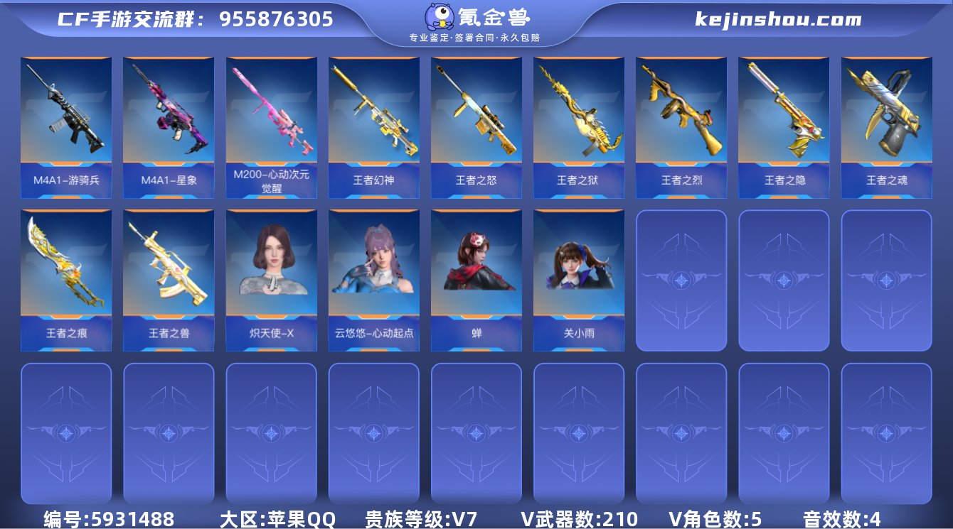 ★可协助解人脸★【新设备不显示二次】苹果QQ-V7-可排位-可转区-钱包已删-210V-收藏149武器-1同框-22王者-2至尊【心至尊、怒至尊】【王者之心、M4A1-雷霆王者-冰皮、王者之兽、王者之怒、王者幻神、王者之狱、王者之魂、王者之迹、王者之隐-冰皮、王者之锋、王者之痕-冰皮、王者之烈】【毁灭套、无影套、AK47-奉先-无双、AK47-华夏传说-起源、AK47-木兰-霓裳铁骑、M4A1-游骑兵-梦魇、M4A1-星象、M4A1-太白诗仙、SCAR-文远、MK47-鼓龙、81式-光明之神-三足金乌、M200-心动次元觉醒、98K-星神、USP-雷暴、COP357-雷霆、MK23-幻神、CZ75-策】【蝉、炽天使-X、关小雨、灵动武士、云悠悠-心动起点】【毁灭音效卡、AK47-无影-电音、雷神音效卡、M4A1-仲达音效卡、MK47-鼓龙-嘴炮】详情看图★星迈游★低价出售找回包赔
