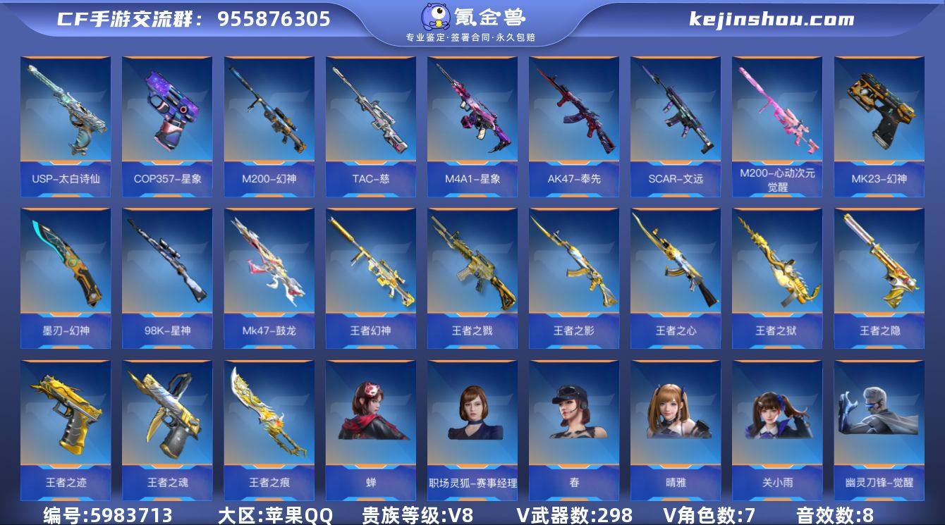 可二次实名 苹果-贵8-可排位-可转区-298V-收藏198武器-21王者-2至尊【幻至尊、狱至尊】【王者之戮、王者之心-拉丝皮、王者之影、王者幻神、王者之狱-冰皮、王者之魂、王者之隐-冰皮、王者之迹-冰皮、王者之啸、王者之痕】【幻神套、诗仙套、M4A1-游骑兵-紫魇、M4A1-星象、SCAR-文远、81式-阿波罗、AK47-常胜、AK47-奉先、AK47-心动次元觉醒、AK47-华夏传说-起源、AK47-木兰、M4A1-堕天神、Scar Light-白虎、QBZ03-金色蔷薇、MK47-仁德、MK47-鼓龙、TAC-慈、AWM-妙才、M200心动次元觉醒、98K-星神、COP357-星象、COP357-雷霆、柯尔特-仲达、USP-神罚、USP-仁德、沙鹰-修罗、沙鹰-天神、黄金COP357、斯泰尔-蝴蝶】【蝉、春、幽灵刀锋-觉醒、关小雨、晴雅、职场灵狐-赛事经理、炽天使-X】【炼狱音效卡、幻神音效卡、王者之心音效卡、毁灭音效卡、无影音效卡、鼓龙-嘴炮、无影-电音、雷神-电音】详情看图★星迈游★低价出售找回包赔