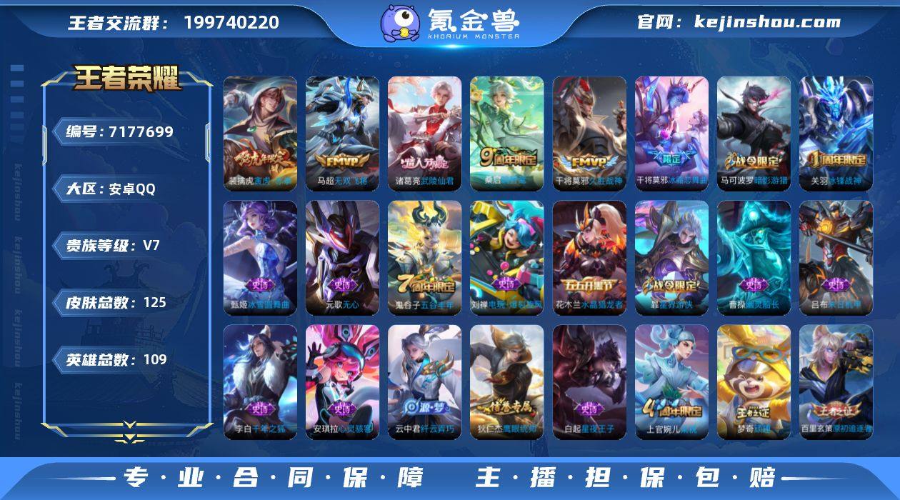 贵族等级:V7 皮肤数:125 英雄数:109 段位:非凡王者 卖家说:万战干将莫邪 双万战 万战干将莫邪 万战马超 万战嬴政