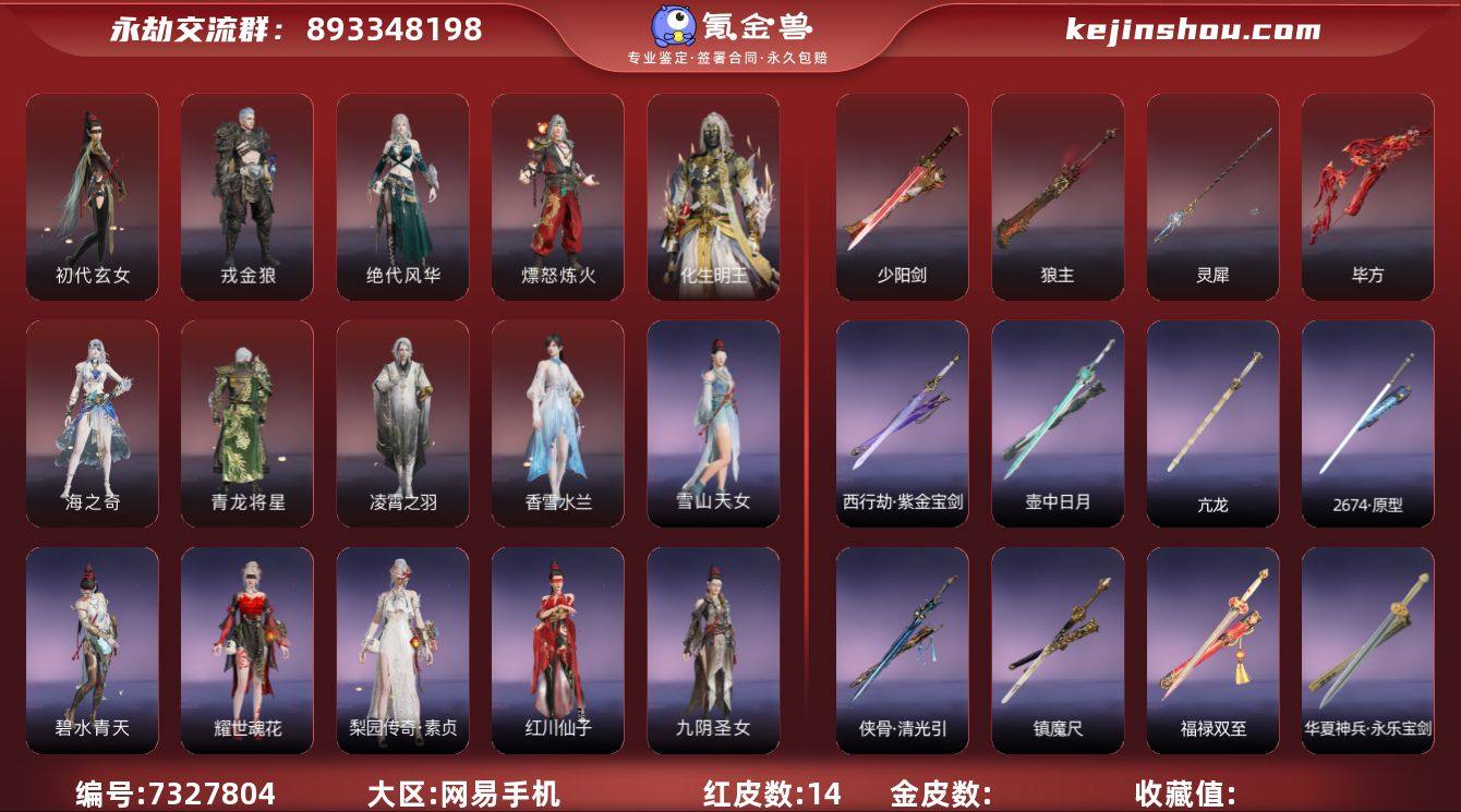 红皮数: 14 版本: 标准版 红皮: 初代玄女(宁红叶皮肤),戎金狼(特木尔皮肤),绝代风华(迦南皮肤),熛怒炼火(季沧海皮肤),海之奇(崔三娘皮肤),青龙将星(岳山皮肤),凌霄之羽(无尘皮肤),香雪水兰(顾清寒皮肤),狼主(阔刀皮肤),灵犀(长枪皮肤),毕方(弓箭皮肤),少阳剑(长剑皮肤),化生明王(天海皮肤) 宁红夜金皮: 雪山天女,碧水青天,九阴圣女,红川仙子,梨园传奇·素贞,耀世魂花 特木尔金皮: 苍狼之主,龙之影·龙虎斗,斗罗大陆·唐三 迦南金皮: 金羽圣鹰,月轮魅影,璨银魔枭,浣烟纱 季沧海金皮: 闻道,逆水寒·江海沧澜,醉山川,游四海,2674·街头烈火,信手斩龙,逆水寒·染烟 胡桃金皮: 阴阳姬,清雅少女,天钿女命,龙之道·至纯,春桃笑 天海金皮: 净金宝相,八宝龙王,裟伽龙王,不动明王,觉之一念 妖刀姬金皮: 流火映真 崔三娘金皮: 掌珠仙子,蛰龙吟 岳山金皮: 骁骑,守誓者,华夏宝甲·汉光,百战·破荆者 无尘金皮: 金羽客,幽篁山鬼 顾清寒金皮: 赤丹朱湛,封神录·龙吉公主 玉玲珑金皮: 封神录·妲己 武田信忠金皮: 枫狩 殷紫萍金皮: 铸神·天禄瑞光 沈妙金皮: 絮云衣,街头狂欢·涂鸦少女 胡为金皮: 斑斓衣,观山海·秋神蓐收,街头狂欢·不败擂主,葫芦兄弟·蛤蟆头领 季莹莹金皮: 夏日派对·盛夏白阳 魏轻金皮: 代号·玉脍,观山海·獬豸 长剑金皮: 壶中日月,含光承影,华夏神兵·永乐宝剑,福禄双至,镇魔尺,侠骨·清光引,西行劫·紫金宝剑,2674·原型,亢龙 太刀金皮: 雷赐,数珠丸,念珠丸,阴阳师·鬼切,魂花晶 阔刀金皮: 听涛,阴阳师·赤影妖刀,山君怒,阴阳师·魂梦残响,青石猊 斩马刀金皮: 神龙刀,西行劫·三尖两刃刀,斗罗大陆·昊天,麒麟牙 长枪金皮: 白虹,九尺沁金耙,击苍穹,玄鲸骨叉,委蛇矛,凌云志,建木,长虹,焦钰 棍金皮: 打狗棒,戒律杖,倒马棍,学宫之杖 匕首金皮: 鹰吻,寻魂,华夏神兵·马首刀,化魄,仙舞,夏日派对·西瓜棒冰 扇金皮: 铁羽 双节棍金皮: 虎摆,精武,...