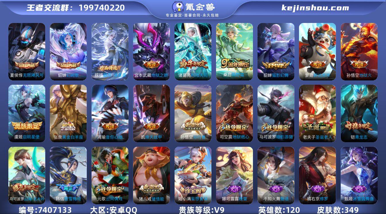 安卓QQ/ V9/ 348皮肤/ 121英雄 【8 稀有英雄】嬴政,不知火舞,橘右京,夏洛特,娜可露露,韩信,艾琳,赵云,【1 珍品传说】器灵·落星盏 嫦娥,【2 典藏皮肤】幻阙歌 貂蝉,无限飓