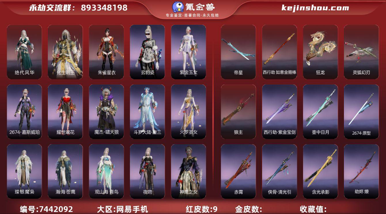 红皮数: 9 版本: 标准版 红皮: 绝代风华(迦南皮肤),灵狐幻刃(太刀皮肤),狼主(阔刀皮肤),狂龙(双节棍皮肤),化生明王(天海皮肤),朱雀星衣(沈妙皮肤),西行劫·如意金箍棒(棍皮肤),帝星(横刀皮肤) 宁红夜金皮: 紫金玉女,玄豹姿,2674·嘉斯威珀,耀世魂花 特木尔金皮: 魔杰·啸天狼,斗罗大陆·唐三 迦南金皮: 璨银魔枭,瀚海苍鹰,火罗圣女,神鹰之女,夜吻,观山海·青鸟 季沧海金皮: 江湖行,游四海,孽炎祸斗,夏日派对·椰风夕照,庖丁·食神,龙心炽焰,信手斩龙,观山海·夏神祝融 胡桃金皮: 承云兰寿 天海金皮: 八宝龙王,若水尊者 妖刀姬金皮: 决战平安京·朔夜游方 崔三娘金皮: 巨鲸客,观山海·文鳐,阿娜希塔 岳山金皮: 龙之影·过江龙,魔杰·撼山岳,弘毅袍,常胜袍,新魔杰·斩魔天将,复制体·尼尔 无尘金皮: 朝闻道,幽篁山鬼,封神录·申公豹 顾清寒金皮: 赤丹朱湛,金襦玉衫 武田信忠金皮: 花之倾奇,麟鹿大铠 殷紫萍金皮: 新倩女幽魂·瑶光沐月,智绘·萍之缘 沈妙金皮: 絮云衣,西行劫·紫衣仙子,观山海·腓腓 胡为金皮: 斑斓衣,行空裘,观山海·秋神蓐收,葫芦兄弟·蛤蟆头领 季莹莹金皮: 护世四法·持国天王,代号·丝莼 魏轻金皮: 逆水寒·极夜天曦 长剑金皮: 壶中日月,含光承影,赤霄,侠骨·清光引,西行劫·紫金宝剑,2674·原型 太刀金皮: 雷赐,念珠丸,魂花晶,锦鲤化龙·落樱,劫烬·燎,黑绳 阔刀金皮: 听涛,阴阳师·赤影妖刀,山君怒,青石猊 斩马刀金皮: 白菜刀,观山海·朱明,劫涛·潮 长枪金皮: 白虹,凌云志,长虹,紫焰火尖枪,观山海·金神钺 棍金皮: 戒律杖,倒马棍,学宫之杖 匕首金皮: 华夏神兵·马首刀,仙舞,桡尺刀 扇金皮: 逍遥,优昙华 双节棍金皮: 精武,镇魔杵,衔谷,法持,除岁,嘶风,傲骨 双刀金皮: 新月,破重云,祸忌,天之刑,天威,蛋仔派对·咸鱼 双戟金皮: 不归,观山海·水衡 横刀金皮: 无韵,百战·无限 万刃轮金皮: 穷奇 弓箭金皮: 暝蛇引,春水,青花