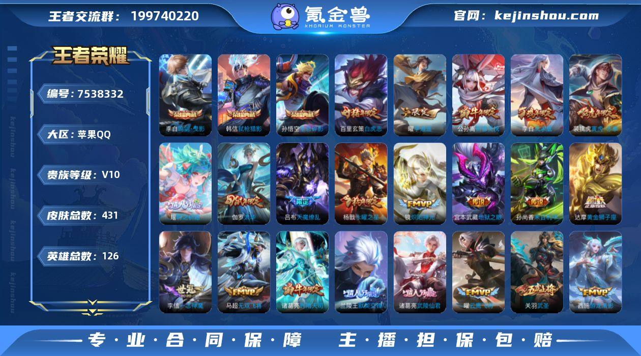 实名: 可修改 性别: 女号 贵族等级: V10 英雄数: 126 皮肤数: 431 荣耀水晶: 鸣剑·曳影,全息碎影,弑枪猎影 传说皮: 黄金狮子座,黄金射手座,冠军飞将,云鹰飞将,绛天战甲,黄金白羊座,猫影幻舞,久胜战神,炽阳神光,一念神魔,云霓雀翎,末日机甲-孙尚香,地狱火,仲夏夜之梦,音你心动-小乔,零号·赤焰,地狱之眼,飞鸢探春,音你心动-周瑜,胖达荣荣,李逍遥,乞巧织情,时之恋人-刘备,游龙清影,淬星耀世,超时空战士-狄仁杰,遇见胡旋,无双飞将,艾琳觅芳踪,启明星使 限定皮: 冰锋战神,遇见飞天,李小龙,奔雷神使,祈雪灵祝,游园惊梦,梁祝,御风骁将,云端筑梦师,时雨天司,引擎之心,龙胆,白鹤梁神女,武圣,烈魂,魔法小厨娘,辉光之辰,玄嵩,白晶晶,岱宗,天狼溯光者,虎魄,天魔缭乱,神威,蜜橘之夏,永曜之星,幽恒,奇迹圣诞,飞衡,乒乒小将,太华,天狼征服者,逐梦之音,青春决赛季,逐梦之翼,天狼狩猎者,冰霜恋舞曲,天狼运算者,逐梦之星,逐梦之影,热情桑巴,逐梦之光,神奇女侠,天狼绘梦者,凤求凰,寅虎·御盾,美猴王,白虎志,青龙志,瑞麟志,玄武志,朱雀志,凤凰于飞,梅西,如梦令-嫦娥,至尊宝,默契交锋-兰陵王,一生所爱,武陵仙君,如梦令-后羿,大圣娶亲,默契交锋-花木兰,寅虎·瑞焰,霸王别姬-项羽,霸王别姬-虞姬,高山流水,孙行者,猪悟能,匿光追影者,女儿国国王,傲雪梅枪,寅虎·赤拳,寅虎·心曲,寅虎·展翼,时之祈愿-云中君,时之祈愿-瑶,玉兔公主,启示之音,五谷丰年,鸣野蒿