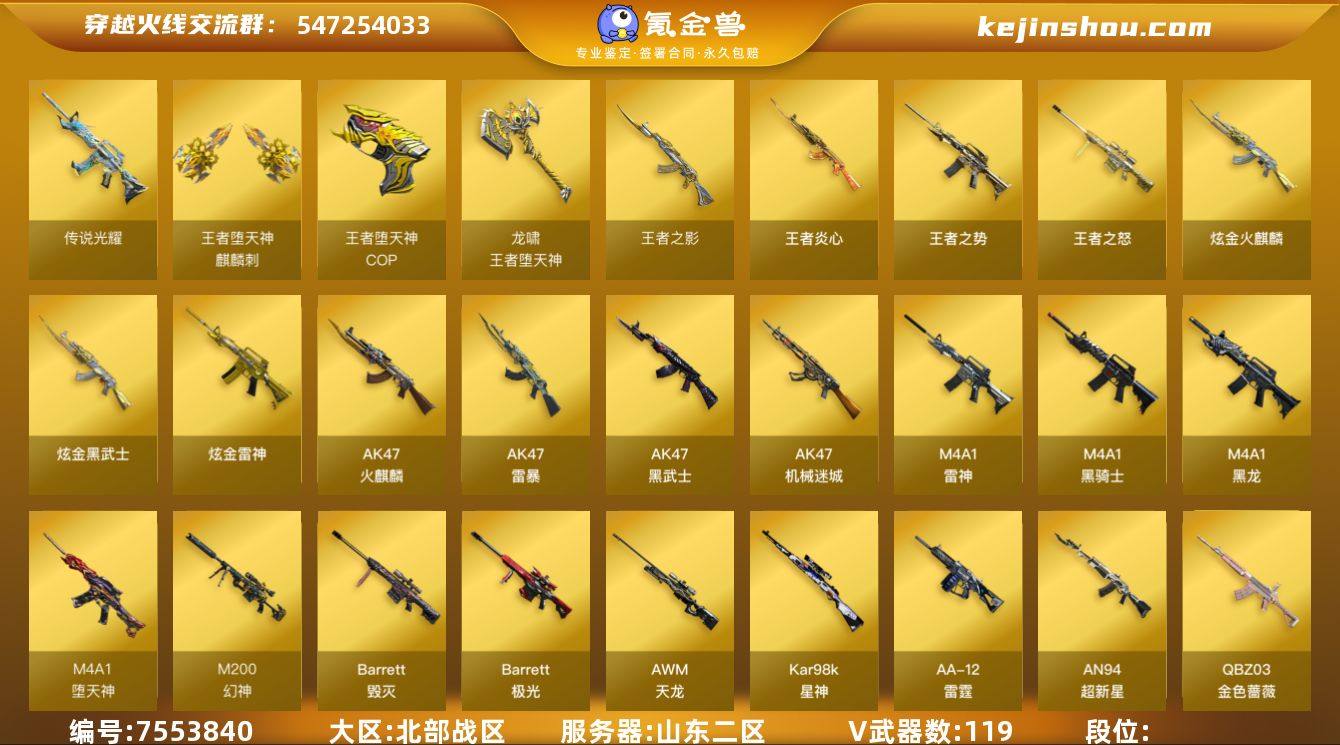 【商品标题】:山东二区-122V-10王者-4炫金【角色】:王者零-传说之路,王者零-华冠丽服,零-水下丽影,灵狐者-职业经理,樱,春,迷迭香,铁骑荣耀,职业选手【热门武器】:传说光耀,王者炎心,M200-幻神,Kar98K-星神,斯泰尔-蝴蝶,死亡之眼,USP-雷暴,COP-堕天神,COP-堕天神,COP-堕天神,沙鹰-修罗,沙鹰-修罗,沙鹰-修罗,沙鹰-修罗,沙鹰-修罗,沙鹰-修罗,M4A1-黑骑士,M4A1-黑骑士,M4A1-黑骑士,M4A1-黑骑士,M4A1-黑骑士,M4A1-黑骑士,M4A1-黑骑士,RPK-盘龙,RPK-盘龙,RPK-盘龙,RPK-盘龙,RPK-盘龙,RPK-盘龙,汤姆逊-烈龙,汤姆逊-烈龙,汤姆逊-烈龙,汤姆逊-烈龙,汤姆逊-烈龙,汤姆逊-烈龙,汤姆逊-烈龙,汤姆逊-烈龙,加特林-炼狱,加特林-炼狱,加特林-炼狱,加特林-炼狱,QBZ03-街机【王者炫金武器】:炫金火麒麟,炫金雷神,炫金雷神,炫金武士,王者炎心,王者之怒,王者之影,王者之势【稀有皮肤】:雷神-星空,雷神-荣耀之魄,M4A1-黑龙-361,幻神-青鹤,屠龙-荣耀之锋,屠龙-荣耀之锋,AK47-火麒麟-传奇EVEN,毁灭-荣耀之怒,雷神-宠儿-2019MVP,黑骑士-CFS2021,黑骑士-摸金校尉,火麒麟-平天大圣,火麒麟-CFSTAR,AWM-天龙-传奇白鲨,天龙-CFSTAR,M4A1-雷神-白鲨皮肤【其他皮肤】:AK47-B-身先士卒【人偶武器】:斯泰尔-蝴蝶,火麒麟-灵狐,火麒麟-灵狐,巴雷特-零-水下丽影,巴雷特-零-水下丽影,巴雷特-零-水下丽影,AWM-灵狐-15周年嘉年华,M4A1-雷神-精英刀锋,M37-葵,COP-旗袍,迷你生化手雷【音效卡】:毁灭音效卡,火麒麟音效卡,黑骑士音效卡,幻神音效卡,雷神音效卡【暴走生化】:斯泰尔-蝴蝶,死亡之眼,超级对讲机【英雄级武器】:M4A1-雷神,M4A1-雷神,M4A1-黑龙,M4A1-黑龙,M4A1-黑骑士,M4A1-黑骑士,M4A1-黑骑士,M4A1-黑骑士,M4A1-黑骑士,M4A1-黑骑士,M4A1-黑骑士,RPK-盘龙,RPK-盘龙,RPK-盘龙,RPK-盘龙,RPK-盘龙,RPK-盘龙,加特林-炼狱,加特林-炼狱,加特林-炼狱,加特林-炼狱,汤姆逊-烈龙,汤姆逊-烈龙,汤姆逊-烈龙,