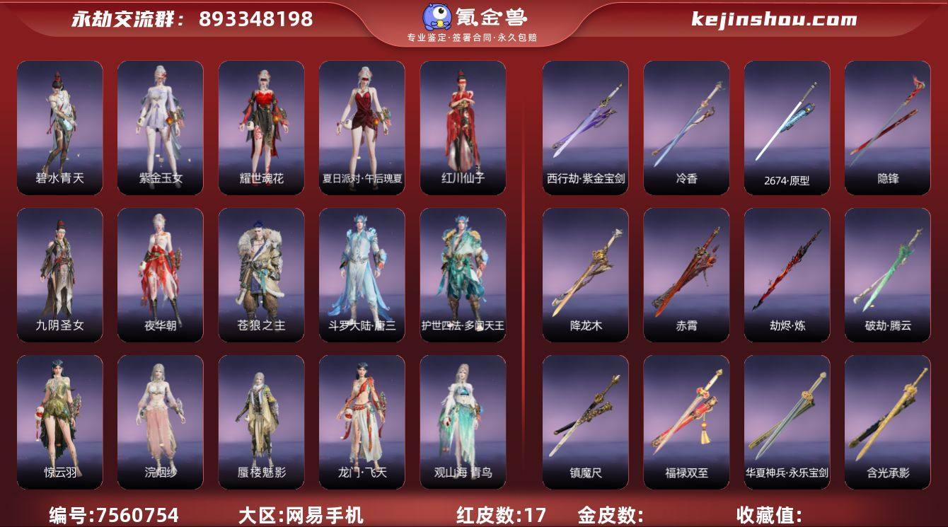 红皮数: 17 版本: 标准版 宁红夜金皮: 碧水青天,九阴圣女,红川仙子,紫金玉女,夏日派对·午后瑰夏,耀世魂花,夜华朝 特木尔金皮: 苍狼之主,斗罗大陆·唐三,护世四法·多闻天王 迦南金皮: 蜃楼魅影,浣烟纱,惊云羽,龙门·飞天,西行劫·白骨夫人,观山海·青鸟,千秋匠心·玉叶景 季沧海金皮: 逆水寒·江海沧澜,江湖行,游四海,瑞火麟,信手斩龙,观山海·夏神祝融,逆水寒·染烟 胡桃金皮: 清雅少女,贵胄少女,天钿女命,龙之道·至纯,承云兰寿,山吹茶 天海金皮: 八宝龙王,裟伽龙王,觉之一念,武道无穷·少林 妖刀姬金皮: 阴阳师·樱雨刀舞 崔三娘金皮: 怒浪,掌珠仙子,探海裙,观山海·文鳐,阿娜希塔 岳山金皮: 骁骑,龙之影·过江龙,守誓者,华夏宝甲·汉光,弘毅袍,西行劫·杨戬,复制体·尼尔,长歌诗韵·戍关将 无尘金皮: 若谷,通玄,金羽客,幽篁山鬼,封神录·申公豹 顾清寒金皮: 姑射真人,寒英素雪,西行劫·玄霜仙兔,西行劫·玉兔精 玉玲珑金皮: 玄绶罗衣,复制体·凯妮 武田信忠金皮: 苍雷丸,狮子丸,击浪 殷紫萍金皮: 智绘·萍之缘 沈妙金皮: 絮云衣,西行劫·紫衣仙子 胡为金皮: 西行劫·悟空,观山海·秋神蓐收,葫芦兄弟·蛤蟆头领 哈迪金皮: 夜绸袍 魏轻金皮: 代号·玉脍 长剑金皮: 含光承影,华夏神兵·永乐宝剑,福禄双至,镇魔尺,冷香,降龙木,破劫·腾云,赤霄,劫烬·炼,西行劫·紫金宝剑,隐锋,2674·原型 太刀金皮: 数珠丸,念珠丸,魂花晶,破劫·洞幽,破劫·炫日,劫烬·燎,自动人形·漆黑誓约 阔刀金皮: 听涛,阴阳师·落樱之刃,恶障,雷王锯,山君怒,自动人形·纯白约定,青石猊 斩马刀金皮: 西行劫·三尖两刃刀,观山海·朱明,劫涛·潮 长枪金皮: 阴阳师·月戟,白虹,击苍穹,玄鲸骨叉,凌云志,建木,镰鼬剃,长虹,观山海·金神钺,自动人形·四零式战术长枪,斗罗大陆·海神三叉戟 棍金皮: 倒马棍,学宫之杖,武道无穷·封魔 匕首金皮: 寻魂,华夏神兵·马首刀,化魄,鹤唳,破劫·千刃,仙舞,桡尺刀...