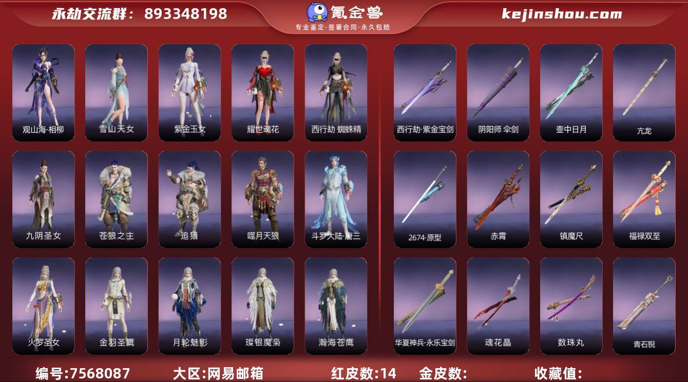 红皮数: 14 版本: 标准版 宁红夜金皮: 雪山天女,九阴圣女,紫金玉女,西行劫·蜘蛛精,耀世魂花,观山海·相柳 特木尔金皮: 苍狼之主,追猎,噬月天狼,斗罗大陆·唐三 迦南金皮: 金羽圣鹰,月轮魅影,璨银魔枭,瀚海苍鹰,火罗圣女,观山海·青鸟,长歌诗韵·胡旋女 季沧海金皮: 闻道,逆水寒·江海沧澜,游四海,夏日派对·椰风夕照,信手斩龙,观山海·夏神祝融 胡桃金皮: 阴阳姬,清雅少女,天钿女命,龙之道·至纯,辉烨少女,长歌诗韵·遣唐使 天海金皮: 净金宝相,裟伽龙王,觉之一念,梨园传奇·法海,若水尊者 妖刀姬金皮: 决战平安京·朔夜游方 崔三娘金皮: 掌珠仙子,赤雾烟霞,观山海·文鳐,阿娜希塔 岳山金皮: 骁骑,龙之影·过江龙,守誓者,弘毅袍,百战·破荆者,复制体·尼尔,铸神·天渊御水 无尘金皮: 若谷,金羽客,封神录·申公豹 顾清寒金皮: 赤丹朱湛,封神录·龙吉公主 玉玲珑金皮: 封神录·妲己 武田信忠金皮: 花之倾奇 殷紫萍金皮: 新倩女幽魂·流纨裙,新倩女幽魂·瑶光沐月,智绘·萍之缘 沈妙金皮: 街头狂欢·涂鸦少女 胡为金皮: 观山海·秋神蓐收,街头狂欢·不败擂主,葫芦兄弟·蛤蟆头领 长剑金皮: 壶中日月,阴阳师·伞剑,华夏神兵·永乐宝剑,福禄双至,镇魔尺,赤霄,西行劫·紫金宝剑,2674·原型,亢龙 太刀金皮: 数珠丸,魂花晶 阔刀金皮: 听涛,暮影,阴阳师·落樱之刃,自动人形·纯白约定,青石猊 斩马刀金皮: 麒麟牙 长枪金皮: 白虹,九尺沁金耙,击苍穹,玄鲸骨叉,凌云志,建木,雪夜·清光引,长虹,紫焰火尖枪,观山海·金神钺 棍金皮: 倒马棍,学宫之杖,冰辉 匕首金皮: 鹰吻,残霄,寻魂,华夏神兵·马首刀,化魄,仙舞,桡尺刀 双节棍金皮: 降魔手,地火涌,九霄寒,镇魔杵,衔谷,除岁,嘶风 双刀金皮: 破重云,绝潮汐,天威,蛋仔派对·咸鱼 双戟金皮: 观山海·水衡 弓箭金皮: 阴阳师·雅矢,狻猊吼,青花