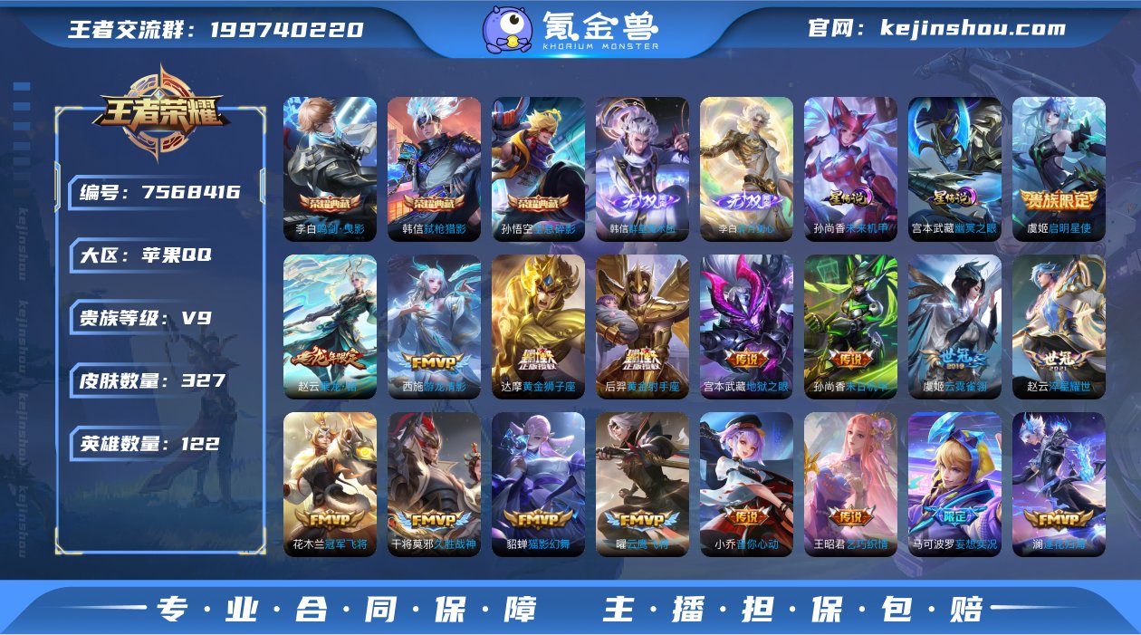 H-GZ11732 苹果QQ V9 327皮 3典藏2星元 101限定24传说2无双 8按键1天幕 打野33段 对抗路24段 发育路20段 金标花木兰/孙悟空/高渐离 19印记 214幸运值 198亲密玫瑰 1228英雄碎片 99蔷薇之心 营地号:498941468 【无 双】韩信群星魔术团,碎月剑心,【荣耀典藏】全息碎影,鸣剑·曳影,弑枪猎影,【星元皮肤】幽冥之眼,未来机甲,【热门限定】逐花归海,凤求凰,至尊宝,乘龙·铭钟鼎,白虎志,神威,冰锋战神,天魔缭乱,永曜之星,时雨天司,御风骁将,天狼溯光者,逐梦之影,青春决赛季,淬星耀世,辉光之辰,蜜橘之夏,太华,飞衡,霸王别姬女,暗影游猎,热情桑巴,启明星使,逐霄战戟,【限定传说】拒霜思,猫狗日记男,久胜战神,电玩小子,云鹰飞将,孙行者,猫影幻舞,蓝屏警告,地狱之眼,苍穹之光,暗夜猫娘,游龙清影,音你心动女,修罗,乞巧织情,冠军飞将,龙骑士,梁祝,未来纪元,神迹守卫,云霓雀翎,黄金狮子座,黄金射手座,天秀·启明,黄金分割率,魅语,千年之狐,末日机甲男,末日机甲女,原初探秘者,原初追逐者,黎明之约,暗隐猎兽者,水晶猎龙者,金属风暴,地狱岩魂,特工魅影,曙光守护者,圣诞恋歌,青蛇,白蛇,舞动绿茵,逐浪之夏,心灵战警,紫霞仙子,功夫厨神,心灵骇客,幽灵船长,乘风破浪,圣诞狂欢,星夜王子,节奏热浪,天才门将,绅士熊喵,暗夜贵公子,偶像歌手,街头霸王,箭羽风息,暗渊魔法,无畏之灵·狰,摇滚巨星,缤纷独角兽,星空之诺,鬼剑武藏,朔望之晖,德古拉伯爵,赤莲之焰,银河之约,猎兽之王,云间偶戏,冰冠公主,花好人间,炼金王,凯尔特女王,饕餮,烛龙,重明,穷奇,御狮,御霄,御旌,御銮,朔风刀,混沌棋,疑决卦,醍醐杖,万华元夜,东方不败,如懿,拳王,女仆咖啡,霸王丸,敏锐之力,丁香结,科学大爆炸,
