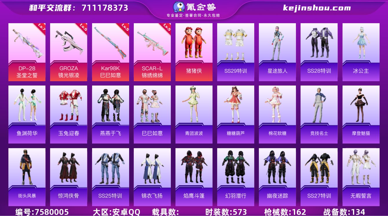 【4特效枪-1粉装-摩登魅猫-贝斯之夜全套-明鸳圣池-无瑕誓言-棉花软糖全套-冰公主-鱼渊荷华-军刀雅典娜-萌趣颜团子-雪山精英老6服-繁龙极客飞行器-素材号】实名: 不可修改 时装数: 573 枪械数: 162 战备数: 134 热门装扮: 猪猪侠 稀有枪皮: DP-28圣堂之誓,SCAR-L-锦绣绵绵,GROZA-镜光银凌,Kar98K-巳巳如意