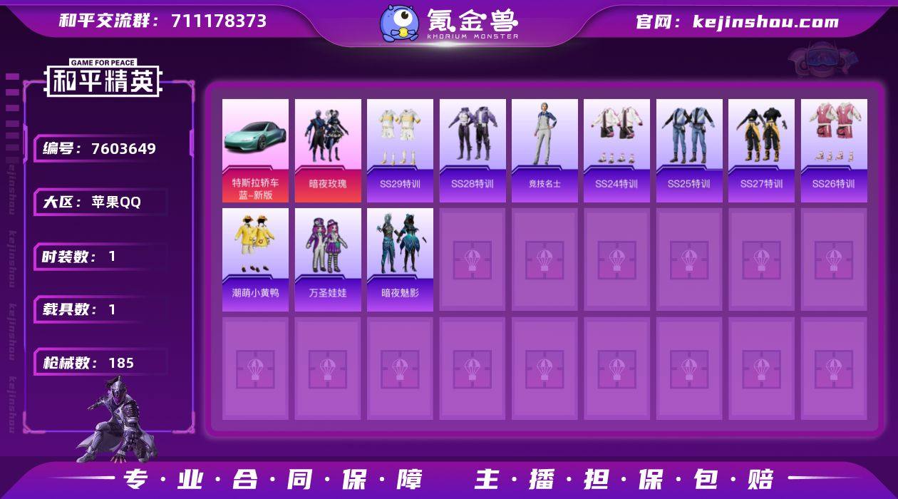 实名: 可修改 时装数: 1 载具数: 1 枪械数: 185 热门装扮: 万圣娃娃,暗夜玫瑰,潮萌小黄鸭,暗夜魅影 载具: 特斯拉Roadster(水滴蓝)