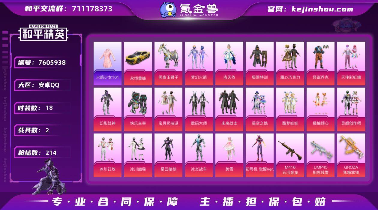 安卓手Q-7王牌印记-有战神框-21粉装-18特效枪-2载具-81291热力值-137套装-214枪皮-2卓越印记-2传奇印记 【21粉装】,梦幻火箭,初号机 觉醒Ver.,甜心巧克力,宝贝奶油派,天使彩虹糖,灵感创作师,洛天依,怪诞乔克,冰炎战车,酣梦娃娃,星云暗核,橘柚倾心,美雪,星空之魅,冰川幽秘,冰川红玫,极限特训,快乐主宰,幻影战神,数码大师,未来战士 【18特效枪】AKM-绿萝繁花-5级 AKM-星际浪客-7级 SCAR-L-纯梦嫁纱-3级 SCAR-L-锦绣绵绵-5级 M416-全功率超战-4级 M416-五爪金龙-4级 GROZA-焦糖拿铁-3级 AUG-超新星-5级 Kar98K-巳巳如意-1级 M24-镜域双华-2级 M200-梦海之灵-1级 Mk14-精灵梦叶罗丽-3级 UMP45-相思残雪-5级 Vector-灵感创作师-4级 P90-沙丘之主-3级 MG3-酷泡奶龙-5级 烟雾弹-猫咪绅士-4级 破片手榴弹-粉粉猫爪-4级 【1热门】,火箭少女101, 【2红装】,沙丘之主-图卡盟,宇宙意识-塞卢姆, 【2稀有载具】,永恒黄蜂,照夜玉狮子, 【137稀有时装】,火箭少女101,都市猎人,2P战斗服款,2B战斗服款,TianBa追光队服,塞卢姆,图卡盟,暗夜行者,奇异狩猎者,暗影哥特,Alan Walker,小丑鱼,龟仙人,龙魂突击队,小熊娃娃,冰河战士,战术大师,雏菊兔兔,SS29特训,萝兰蝴蝶,无暇誓言,明鸳圣池,贝斯之夜,舰行太空,焰鹰斗篷,迎夏光舞,诡夜天鹅,银河圣歌,忠猛周仓,龙的传人,甜梦熊熊,白熊同盟,青玉碎影,萌黄之夏,萌趣绒叽,热血青春,太极红客,酷潮明星,绯格组合,涂山之恋,SS26特训,漫步者,空岛之星,热情海星,纯真浪花,竞技名士,忠真马岱,长空猛禽,粉团憨憨,六六大吉,惊鸿侠骨,魅力单车,云霞荷露,春光漫游,水银刺客,TianBa战队服,街舞达人,青涩时光,青春校园,萌趣咩咩,娇憨猪猪,幻影公爵,WiFi精灵,麻辣教官,鹰眼刺客,冰冻风暴,幽夜迷踪,快闪甜心,梦幻奶油,酸甜橘柚,坚韧舞者,淡雅花蕊,