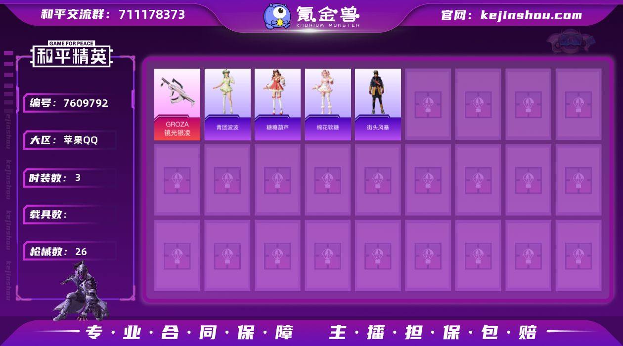 实名: 可修改 时装数: 3 枪械数: 26 稀有枪皮: GROZA-镜光银凌