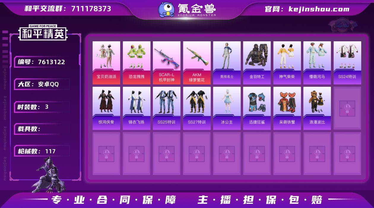 实名: 不可修改 时装数: 3 枪械数: 117 热门装扮: 呆萌铁蟹,宝贝奶油派,浪漫波比,迅捷狂鲨,恐龙拽拽 稀有枪皮: SCAR-L机甲封神,AKM绿萝繁花