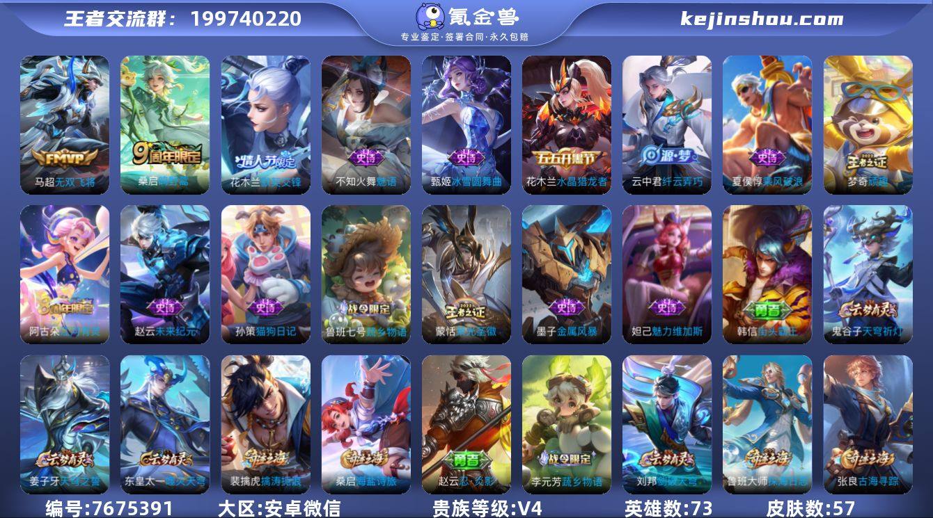 【商品标题】:安卓WX-V4-最强王者段位-73英雄-57皮肤-0典藏-0无双-0珍品传说-2传说-14史诗【内测皮肤】:狂铁特工战影【传说皮肤】:马超无双飞将,桑启鸣野蒿【限定皮肤】:姜子牙天穹之誓,狄仁杰阴阳师,项羽海滩派对,花木兰默契交锋,梦奇顽趣,裴擒虎擒涛扼浪,云中君纤云弄巧,鲁班大师探海日志,桑启海盐诗旅,阿古朵江河有灵,张良古海寻踪,蒙恬荣光圣徽,鬼谷子天穹祈灯,鲁班七号蔬乡物语,李元芳蔬乡物语,刘邦剑破天穹,程咬金群星魔术团,周瑜熔金海岸【赛季限定】:张良古海寻踪,梦奇顽趣,裴擒虎擒涛扼浪,鲁班大师探海日志,桑启海盐诗旅,鬼谷子天穹祈灯,蒙恬荣光圣徽,刘邦剑破天穹,姜子牙天穹之誓【战令限定】:鲁班七号蔬乡物语,李元芳蔬乡物语【史诗皮肤】:妲己魅力维加斯,赵云未来纪元,墨子金属风暴,夏侯惇乘风破浪,甄姬冰雪圆舞曲,花木兰水晶猎龙者,花木兰默契交锋,不知火舞魅语,梦奇顽趣,云中君纤云弄巧,孙策猫狗日记,阿古朵江河有灵,蒙恬荣光圣徽,鲁班七号蔬乡物语【其他皮肤】:韩信教廷特使,韩信街头霸王,刘备万事如意,孙膑天使之翼,赵云忍炎影,亚瑟死亡骑士,狂铁特工战影,芈月红桃皇后,老夫子功夫老勺,李元芳妄想特派,太乙真人劲辣红锅,扁鹊救世之瞳,关羽龙腾万里,李元芳蔬乡物语,程咬金群星魔术团,周瑜熔金海岸【