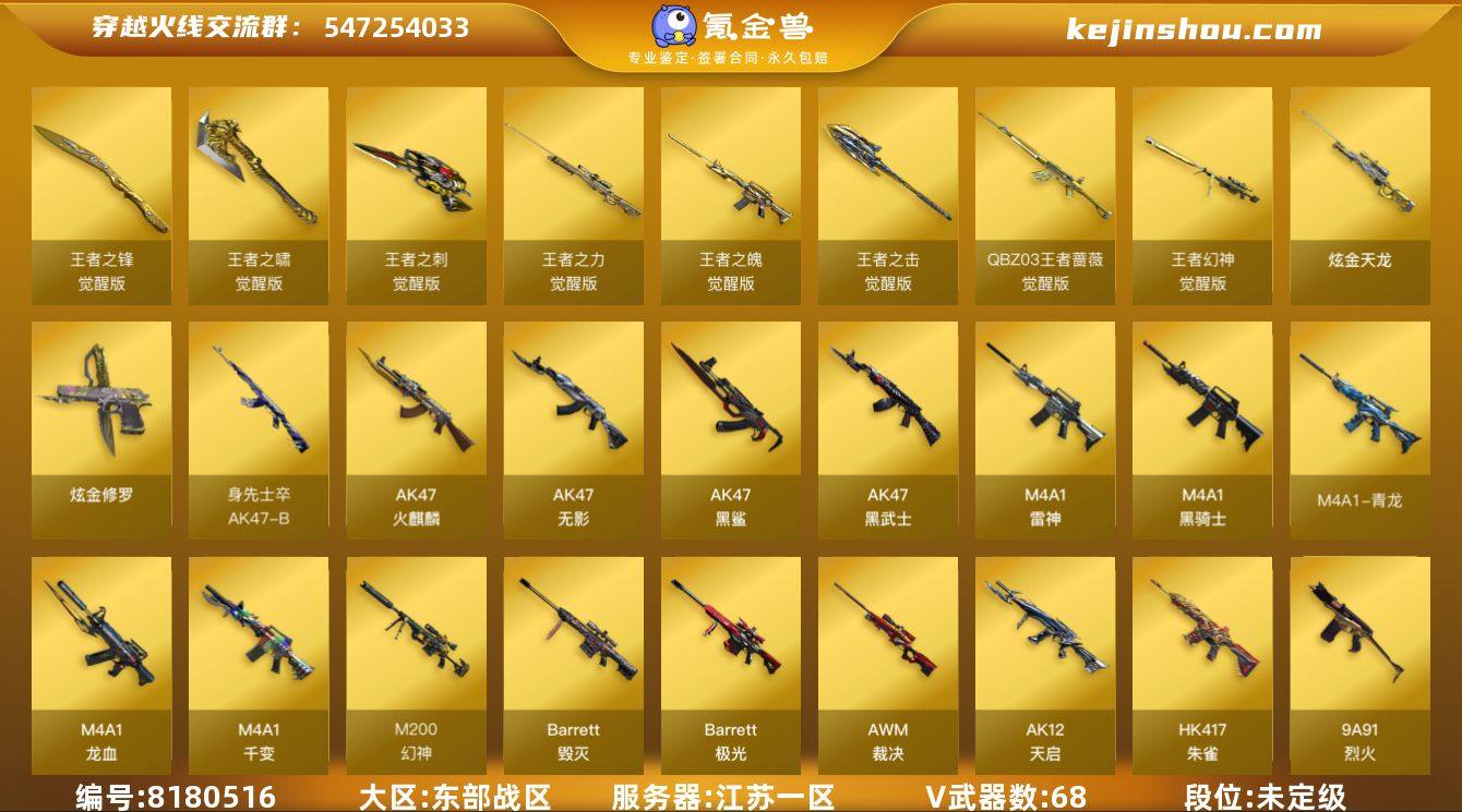 实名: 可修改 排位资格: 有 V武器: AK47-火麒麟,AK47-无影,AK47-黑鲨,AK47-黑武士,M4A1-雷神,M4A1-黑骑士,M4A1-青龙,M4A1-龙血,M4A1-千变,Barrett-毁灭,Barrett-极光,AWM-裁决,M200-幻神,AK12-天启,HK417-朱雀,9A91-烈火,RPK-盘龙,汤姆逊-烈龙,加特林-炼狱,沙鹰-修罗,沙鹰-天神,屠龙,龙啸,麒麟刺,擎天,AK47-B-常胜将军,Barrett-暗月传说,AK47-B-战士,裁决,烈龙,盘龙,天神,修罗,柯尔特-冠军之特,M14EBR-玄武,G36C-幻影,AK47-B-身先士卒 王者武器: 王者幻神-觉醒版,QBZ-03-王者蔷薇-觉醒版,王者之击-觉醒版,王者之魄-觉醒版,王者之力-觉醒版,王者之刺-觉醒版,王者之啸-觉醒版,王者之锋-觉醒版 炫金武器: 炫金天龙,炫金修罗 狙击枪稀有皮肤: 毁灭-荣耀之怒,毁灭耀金皮肤,毁灭-战神张飞,M200-幻神-黄忠,天龙-能量核心,毁灭-枪娘格雷姐妹,幻神-巅峰荣耀 英雄角色: 审判者,王者-瞳-闭月羞花,炫,雨棠,炽天使,灵动武士,王者春,职业选手 音效道具: Barrett-极光音效卡,M4A1-黑骑士音效卡,M200-幻神音效卡,绝迹语音包
