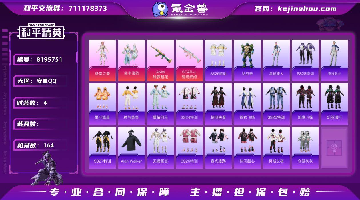 实名: 可修改 时装数: 4 枪械数: 164 热门装扮: 仓鼠灰灰,圣堂之誓,金丰海韵 稀有枪皮: AKM绿萝繁花,SCAR-L-锦绣绵绵 亮点: 2粉装-4特效枪