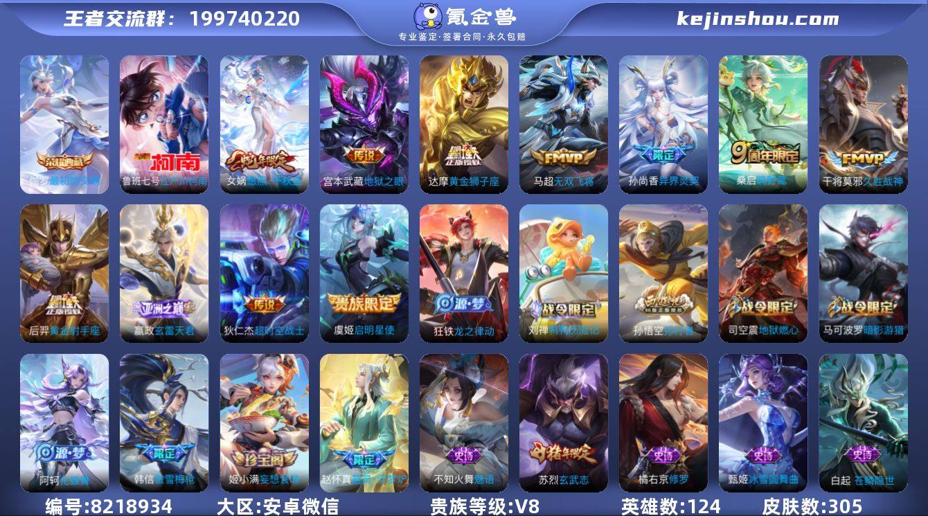 安卓微信/ 302皮肤/ 123英雄 【1 珍品传说】江户川柯南 鲁班七号,【1 典藏皮肤】最初的交响 伽罗,【11 传说皮肤】启明星使 虞姬,无双飞将 马超,地狱之眼 宫本武藏,黄金射手座 后