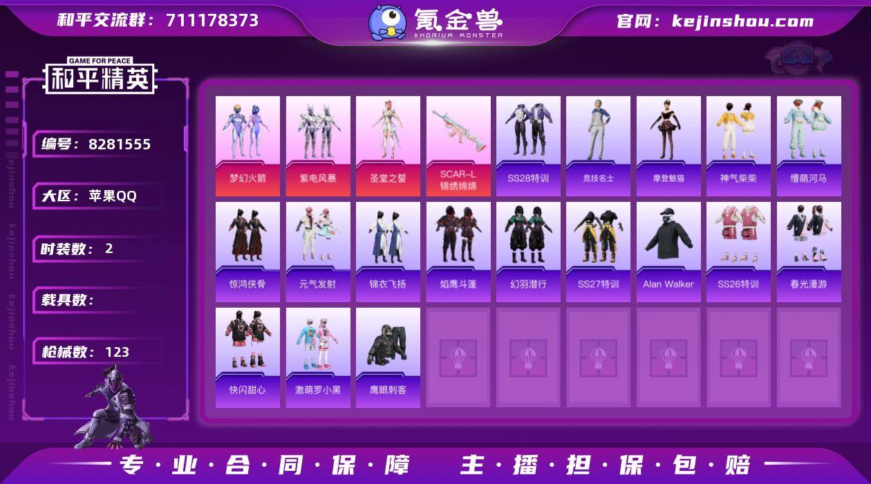 实名: 可修改 时装数: 2 枪械数: 123 热门装扮: 梦幻火箭(新101),鹰眼刺客,紫电风暴,激萌罗小黑,圣堂之誓 稀有枪皮: SCAR-L-锦绣绵绵