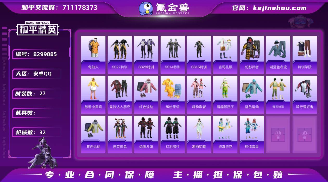 【1475】安卓 手Q-6粉装-3特效枪-0载具-2粉色飞行器-53715热力值-14王牌印记-147套装-179枪皮 【热门品类】:套装-小丑鱼,套装-龟仙人 【粉色套装】:粉装-太空嘟嘟,粉装-飒粉甜心,粉装-拂晓神骑,粉装-炫光之旅,角色-圣堂之誓,套装-创世·救赎 【粉色枪皮等级】:Kar98K-巳巳如意(五级),SVD-月影灵韵(五级),DP-28-豹影疾电(五级) 【粉色枪皮】:Kar98K-巳巳如意,SVD-月影灵韵,DP-28-豹影疾电 【粉色降落伞】:梦幻火箭降落伞,筑梦精灵降落伞,旋转彩虹降落伞,拂晓神骑降落伞,闲梦青缨降落伞,雪月幻音降落伞,圣域龙灵降落伞 【稀有套装】:套装-龟仙人,套装-巳巳如意,套装-雏菊兔兔,套装-萝兰蝴蝶,角色-米开朗基罗,套装-糖糖葫芦,套装-青团波波,套装-棉花软糖,角色-猎影月神,套装-云朵鹅,套装-雪绒豹,套装-蓝海鲸歌,角色-绯色魅影 【稀有枪皮】:AKM-2P战斗服款,AKM-彩虹符号,AKM-灼热熔岩,AKM-环太平洋,AKM-破晓战魂,AKM-筑梦精灵,AKM-霓虹街区,AKM-龙的传人,M16A4-幻世战舞者,M16A4-甜心亚梦,M16A4-红色方程式,M16A4-蓝色火焰,SCAR-L-幽秘魅影,SCAR-L-玉兔迎春,SCAR-L-红色方程式,SCAR-L-冷漠罗丽,M416-夜灯,M416-月影鸳鸯,M416-糯团青竹,M416-红色方程式,M416-绯红前夜,M416-蓝色火焰,GROZA-恐龙拽拽,GROZA-懵萌河马,AUG-天降萌叽,AUG-耀粉歌者,QBZ-飞驰魅影,M762-天降萌叽,M762-奇异狩猎者,M762-绯红前夜,M762-云朵鹅,G36C-懵萌河马,AC-VAL-天降萌叽,AC-VAL-快闪甜心,AC-VAL-甜心亚梦,蜜獾-千面幻镜,蜜獾-天降萌叽,蜜獾-娇憨猪猪,UZI-啾咪啾咪,UZI-娇憨猪猪,UZI-红色方程式,UMP45-涂山之恋,UMP45-生命誓言,UMP45-蓝色火焰,Vector-生命誓言,汤姆逊-天降萌叽,汤姆逊-炫彩节奏,汤姆逊-耀粉歌者,P90-快闪甜心,P90-飞驰魅影,P90-巳巳...