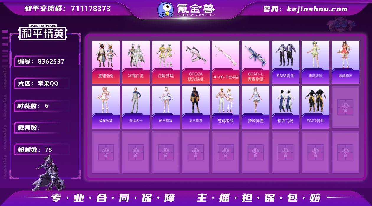 实名: 可修改 时装数: 6 枪械数: 75 热门装扮: 冰霜白皇,童趣迷兔,庄周梦蝶 稀有枪皮: SCAR-L青春物语,DP-28-千金淑猫,GROZA-镜光银凌