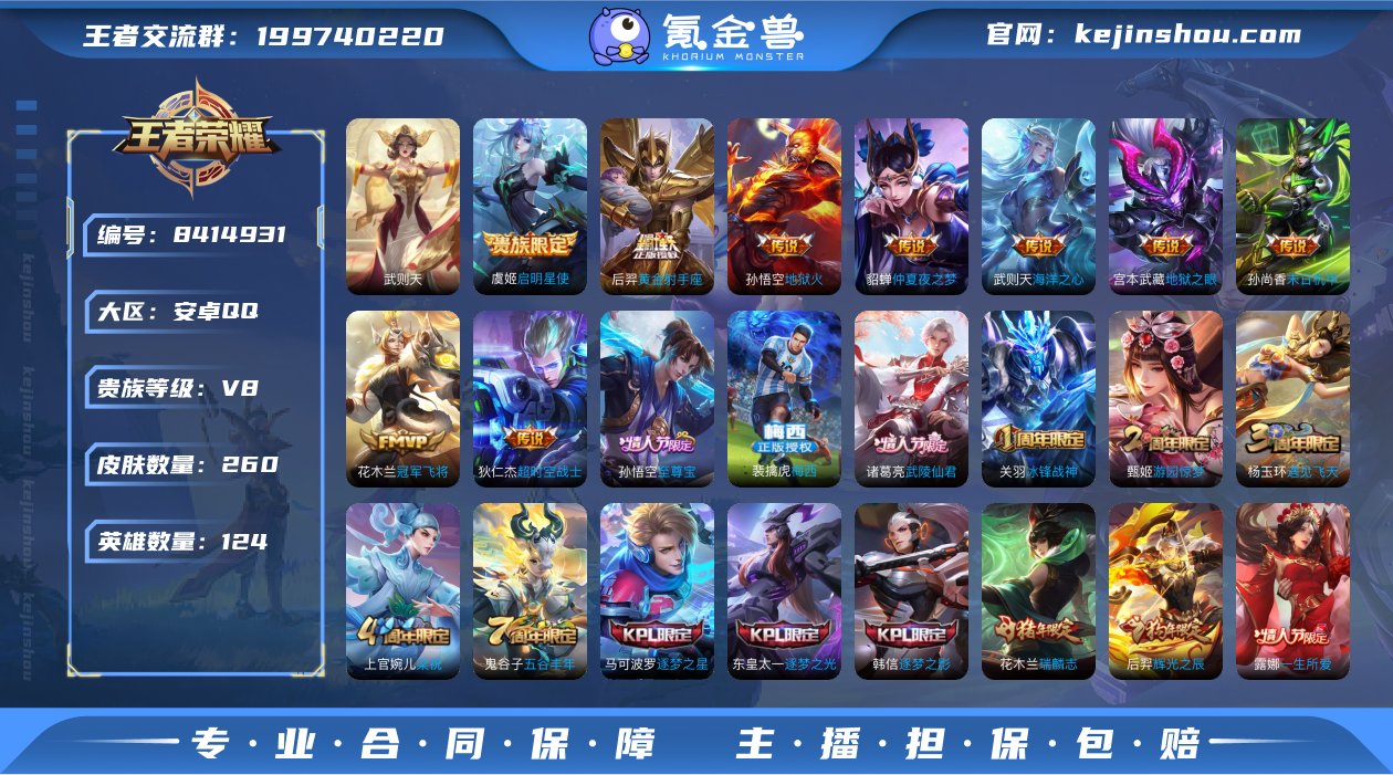 (有武则天,充了7000多)连体穿越火线手游v8(氪金兽商品编号为8414884)具体的可以看一下商品描述截图。王者幻神+冰皮,tac慈,星象,奉先带无双皮肤,awm游骑兵带皮肤,m4a1武圣,孟获,王者之影+冰霜奇迹皮肤(带紫电光效和命中数字),有王者之翼的女团皮肤。王者之神,王者之迹。王者之狱,角色有云悠悠。an94盖有80多碎片。