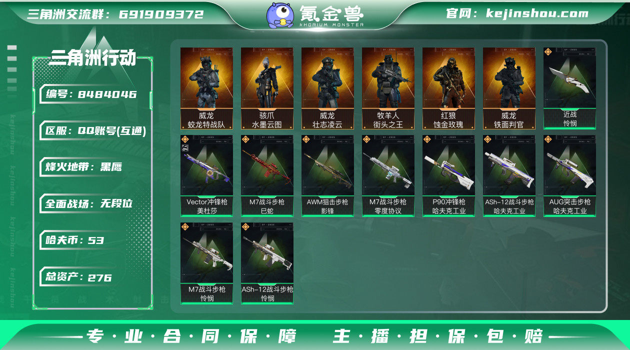 hf4125 总资产276m 纯币53m+非洲之心+饰金玫瑰红狼全套+水墨云图骇爪全套+怜悯全套+蛟龙特战队全套+哈夫克工业全套+m7零度协议+awm影锋+巳蛇m7+优品c美杜莎+毁灭之源+四赛季通行证+烽火等级60 特勤部门等级很高 s3赛季巅峰战神 永久包赔